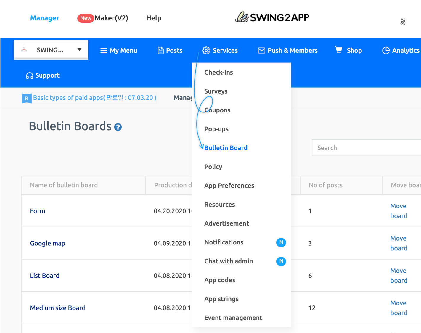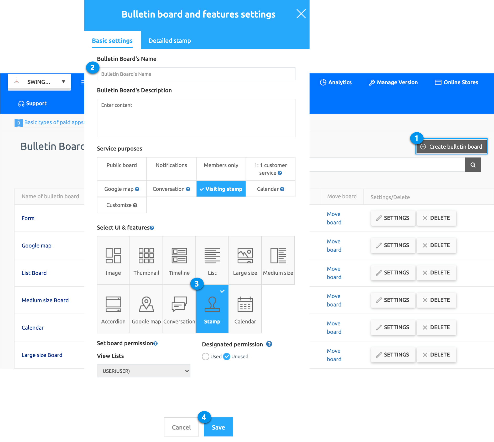 Swing2App Manager page → Bulletin Board > [Create bulletin board] button → select [Stamp] service.