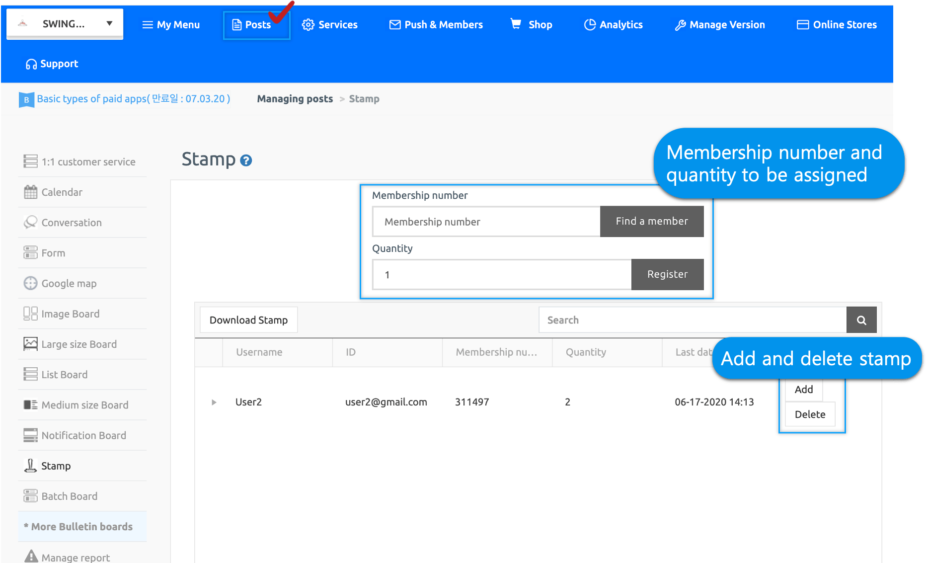 After accessing the swing2app home page, go to the Manager page → Posts management → Stamp, there will be a button to enter and register your membership number.