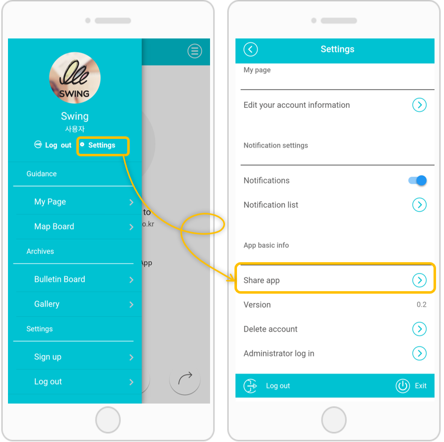 If you select the [Settings] menu from the app menu, there is [Share app].