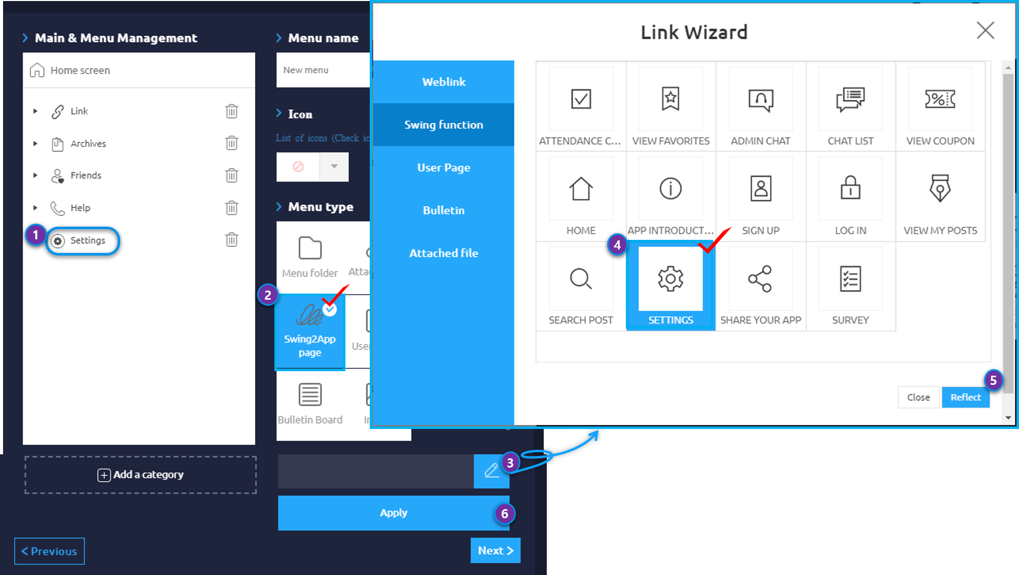 [Settings] menu is a menu provided by Swing2App.