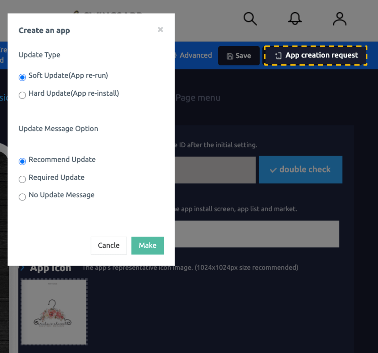 3) Select the [App Creation Request] button on the app production page (if you create a new app, it will be converted to the free version).
