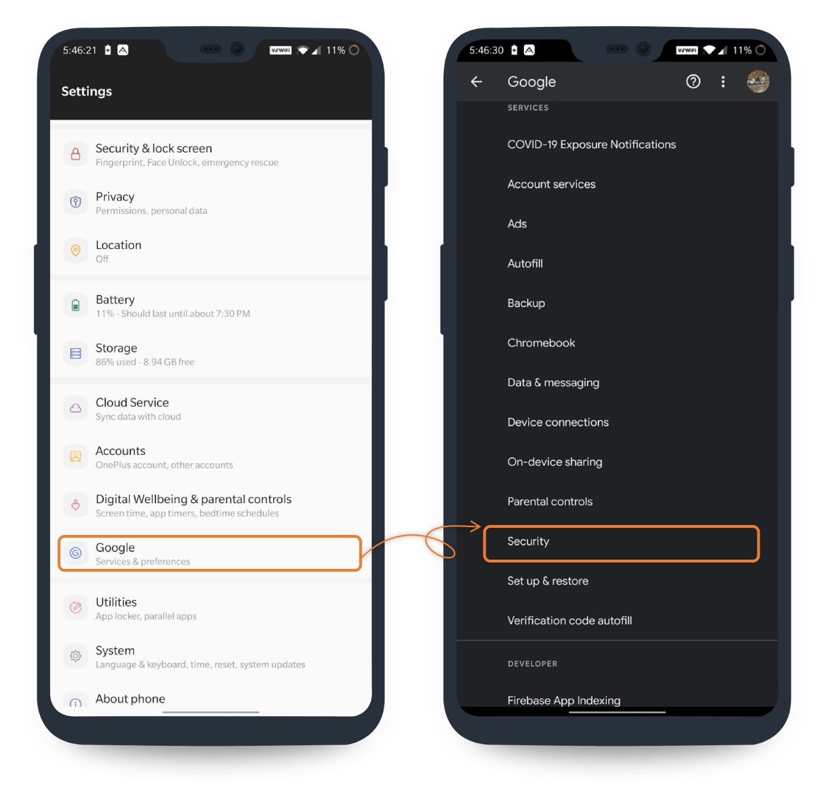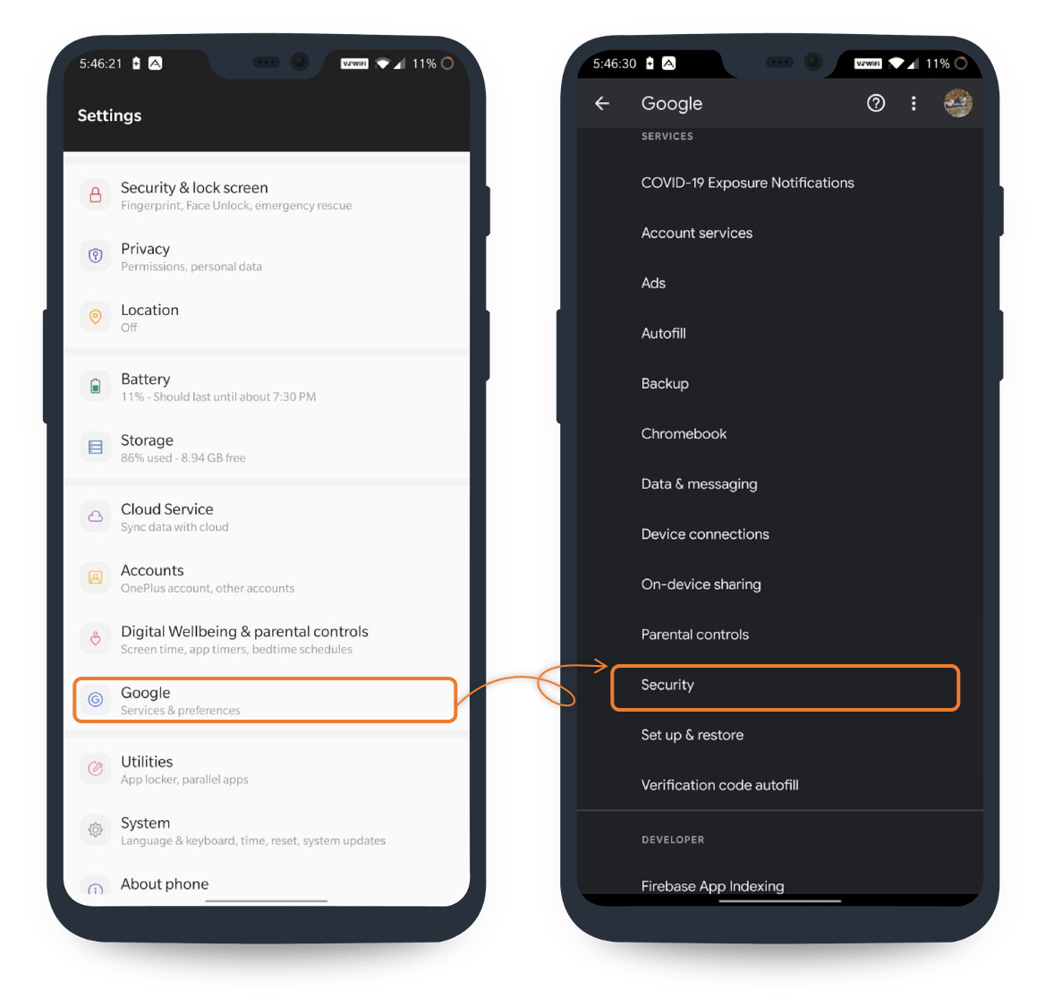 *The menu is slightly different for each Android phone model and version. Go to the Google menu in the Settings menu and click the Security menu.