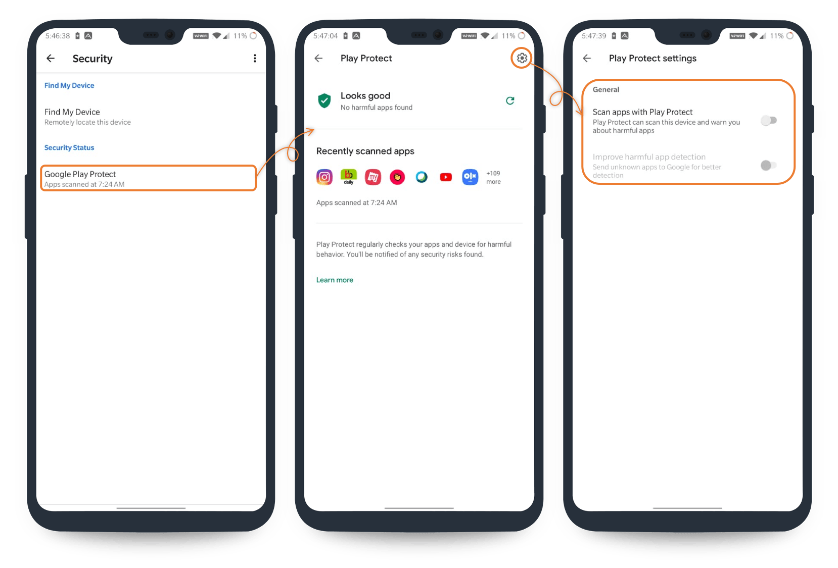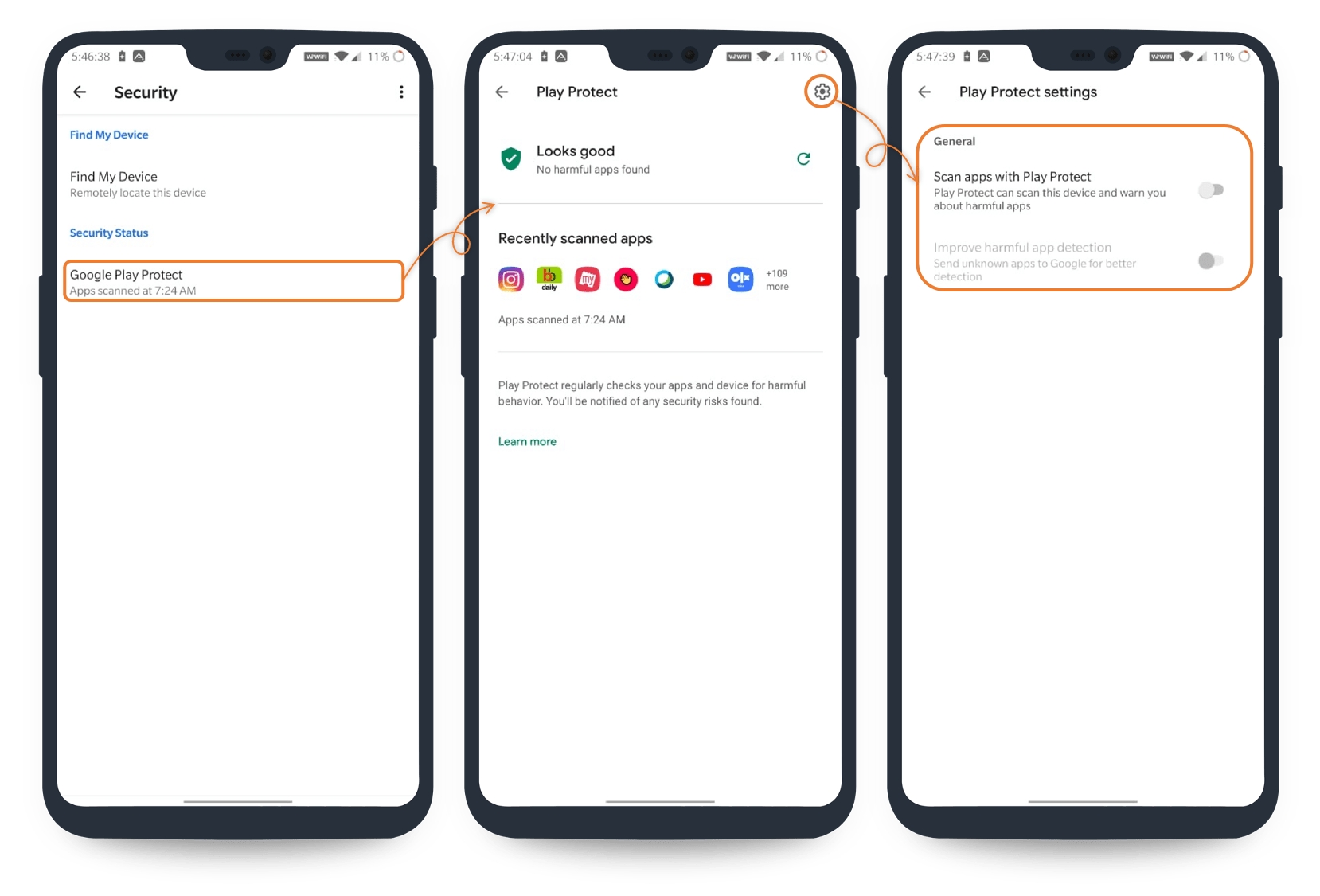 Unchecked the two items: “Scan apps with Play Protect” and “Improve harmful app detection”.