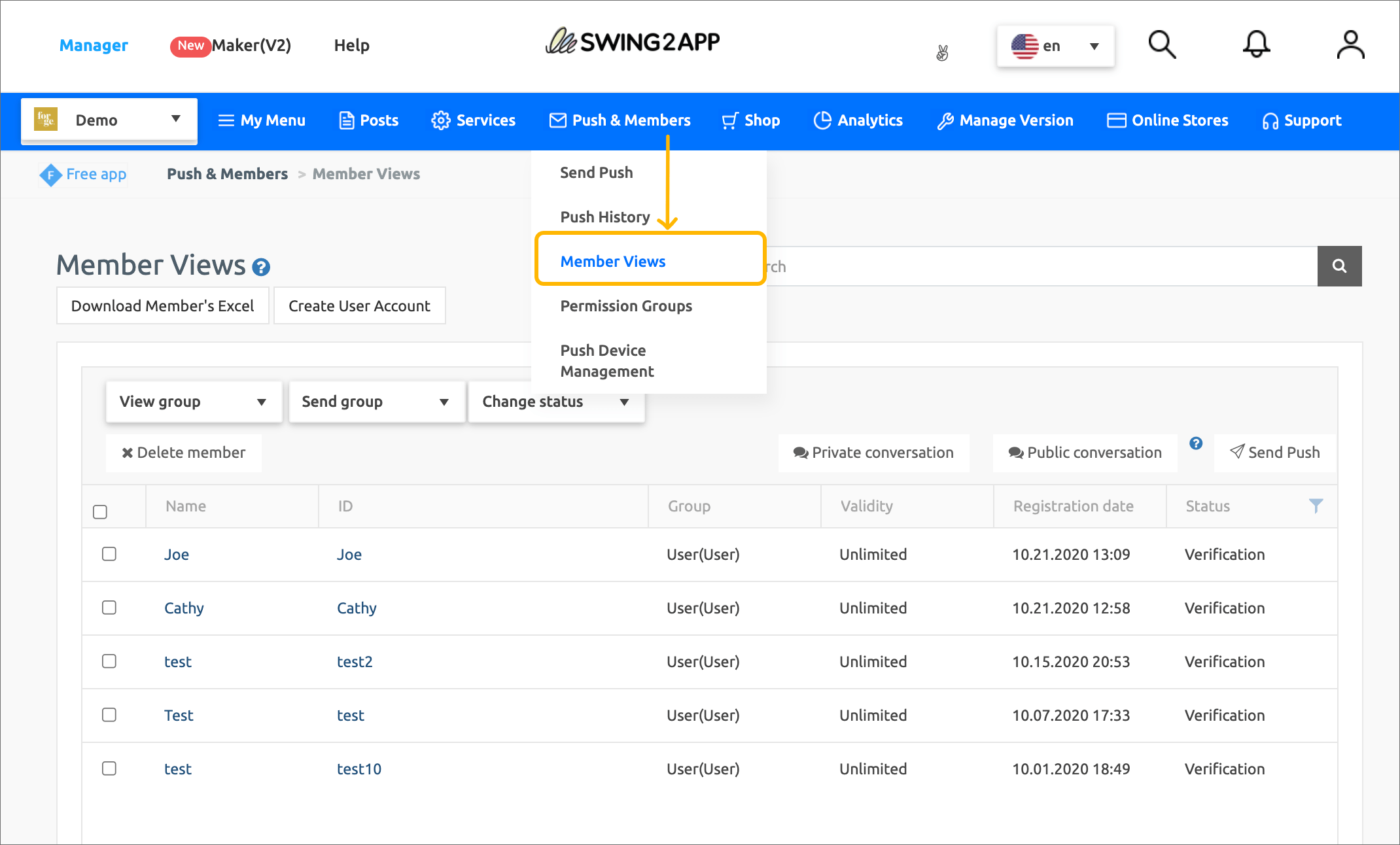 Manager → Push & Member → Go to the Member Views page.