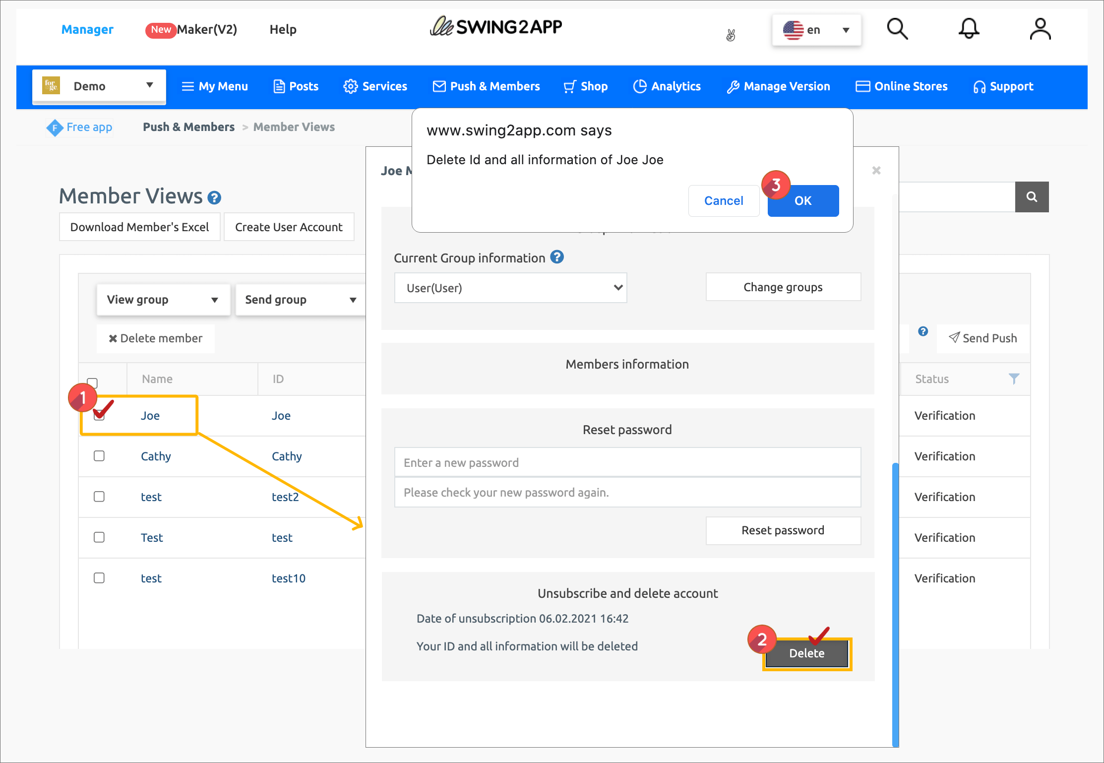 2) Delete member button.