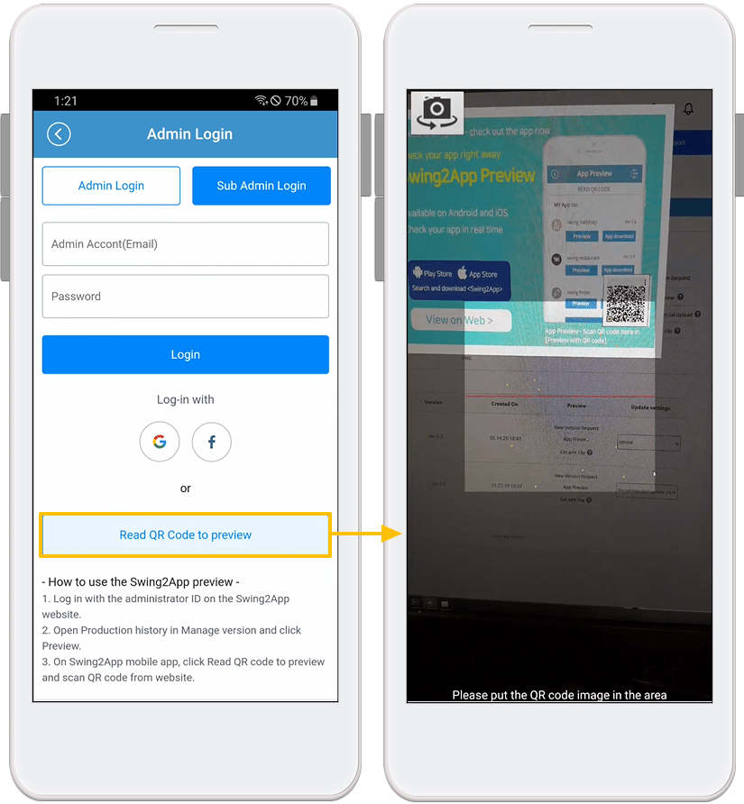 In addition to the administrator login, Swing2App Preview can also preview the app by taking a QR code.