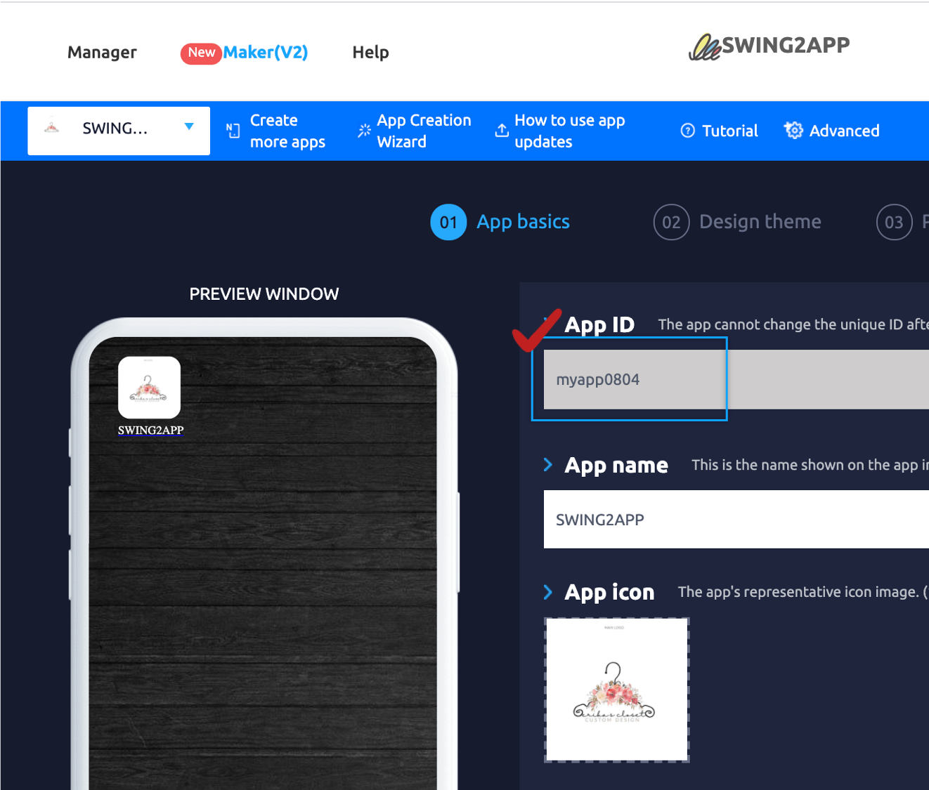 The app ID can be checked by the swing2app production page → step 1 app basic information, if you view the app ID.