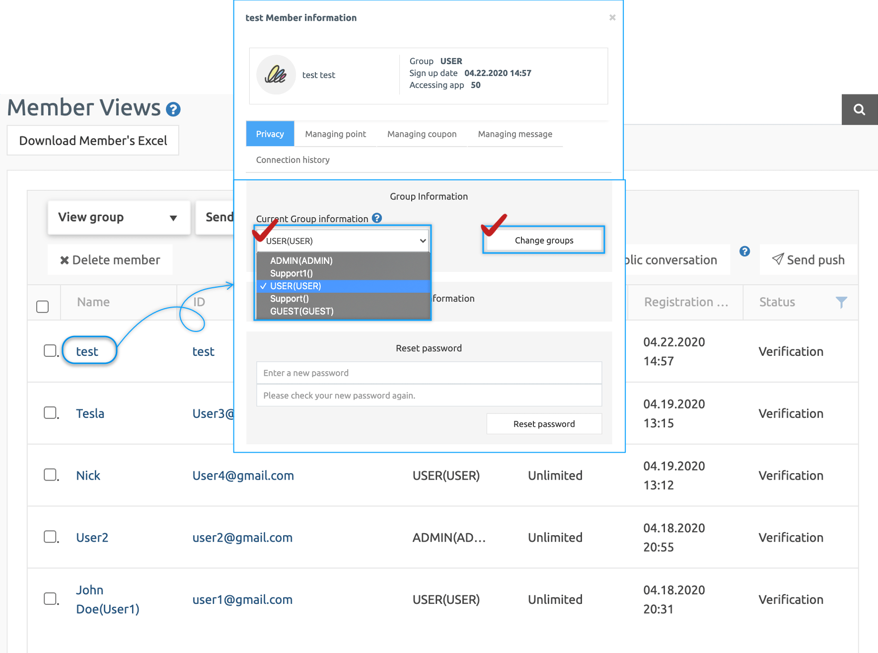 Select [Current Group Information] → select ‘ADMIN” → select [Change Group] to complete the change.