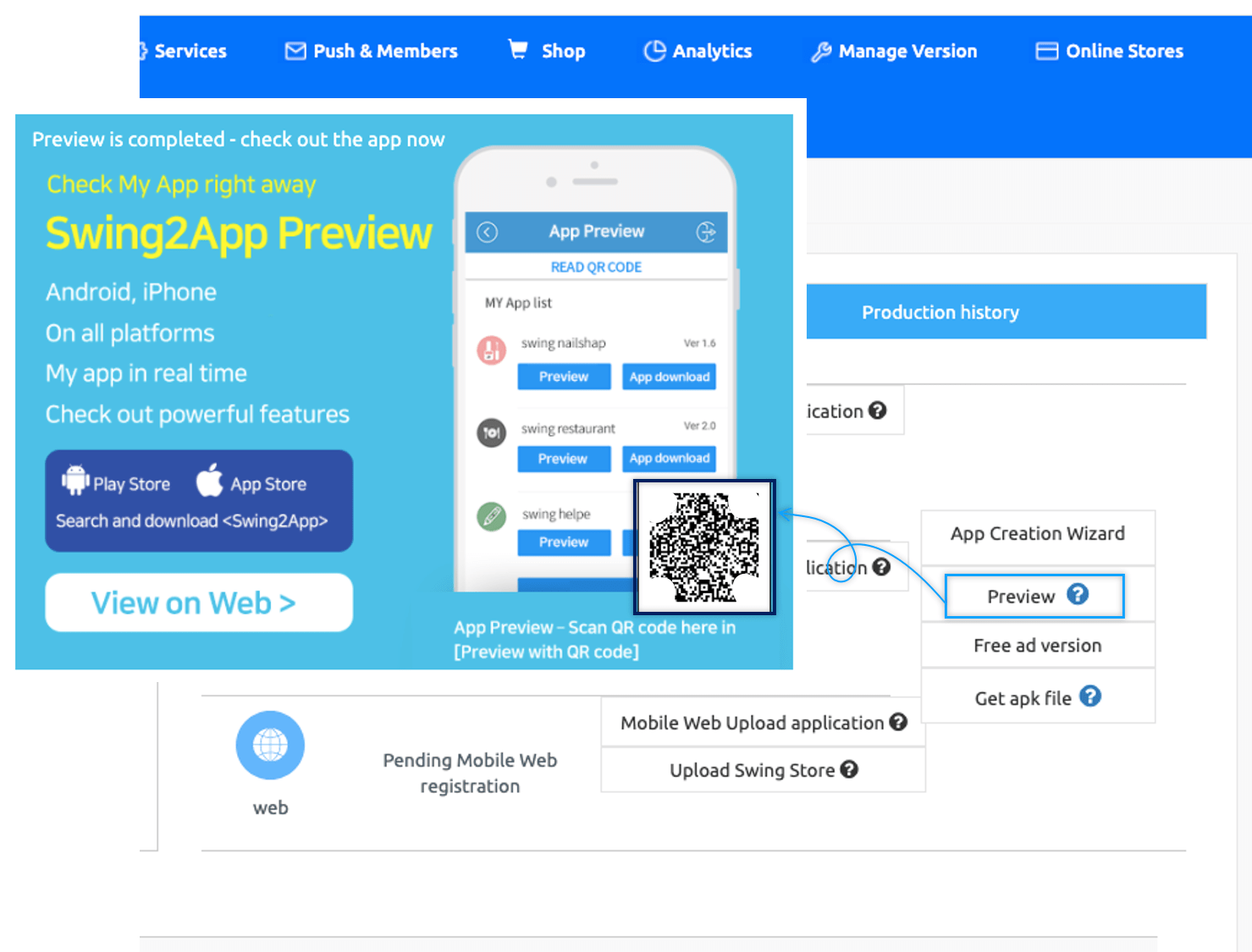Launch Swing2App – App Preview – Select the [Preview by QR Code] button → Bring your phone to the QR code image and the app will run as a preview on your phone.