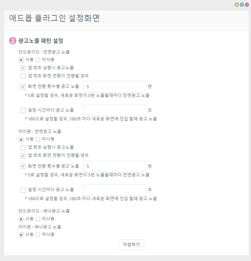 3)Exposure of advertisements by number of screen transitions ->You can set the number of ad exposures that appear as the screen transitions. When set to ‘Example’5’, full-page advertisements are exposed when the screen is switched 5 times.