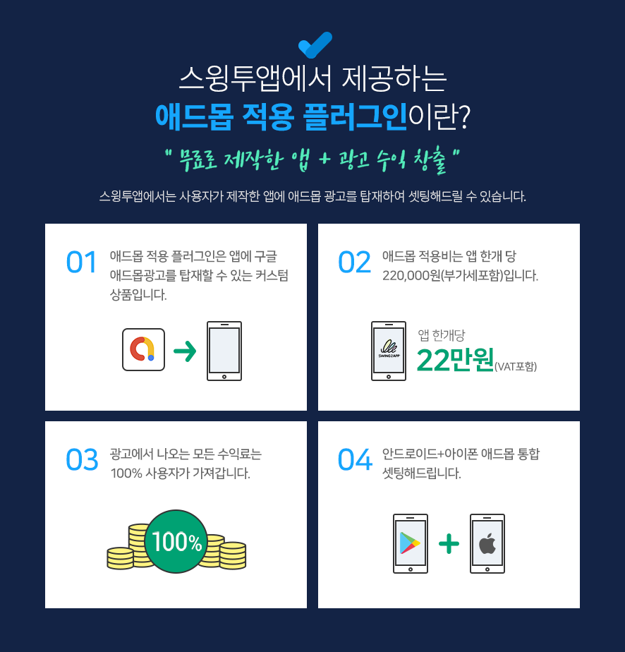 2) Add-Mob Power Package ($580): Plug-in with AdMob + basic swing pass (2 years/24 months) + 1 upload ticket (App store upload ticket, Play Store upload ticket) are provided together.