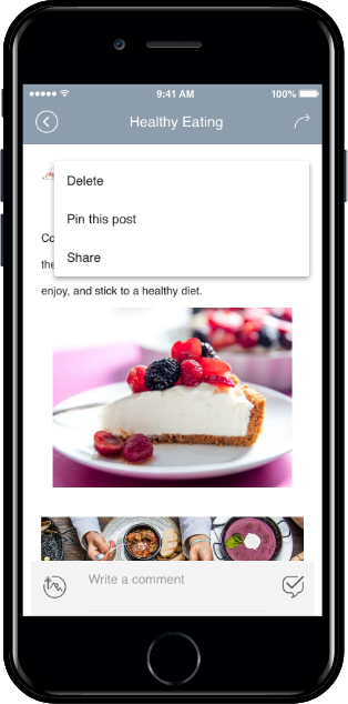 Log in to the admin account from the app. Please go to the bulletin board designated as an administrator. In posts written by other users, you can check the [Delete, Pin this post, Share] menu by selecting the three dots at the top. In the bulletin board applied as an administrator, you can delete a post registered by another user or pin them.