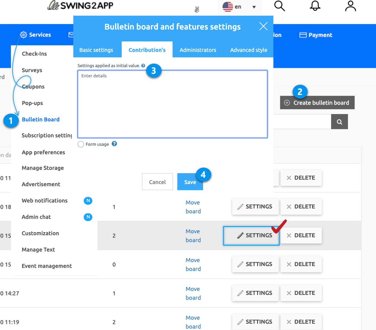 If you need to create a new board on the board management page, click on Create Bulletin Board button. If a bulletin board is created, click the Settings button on the bulletin board.