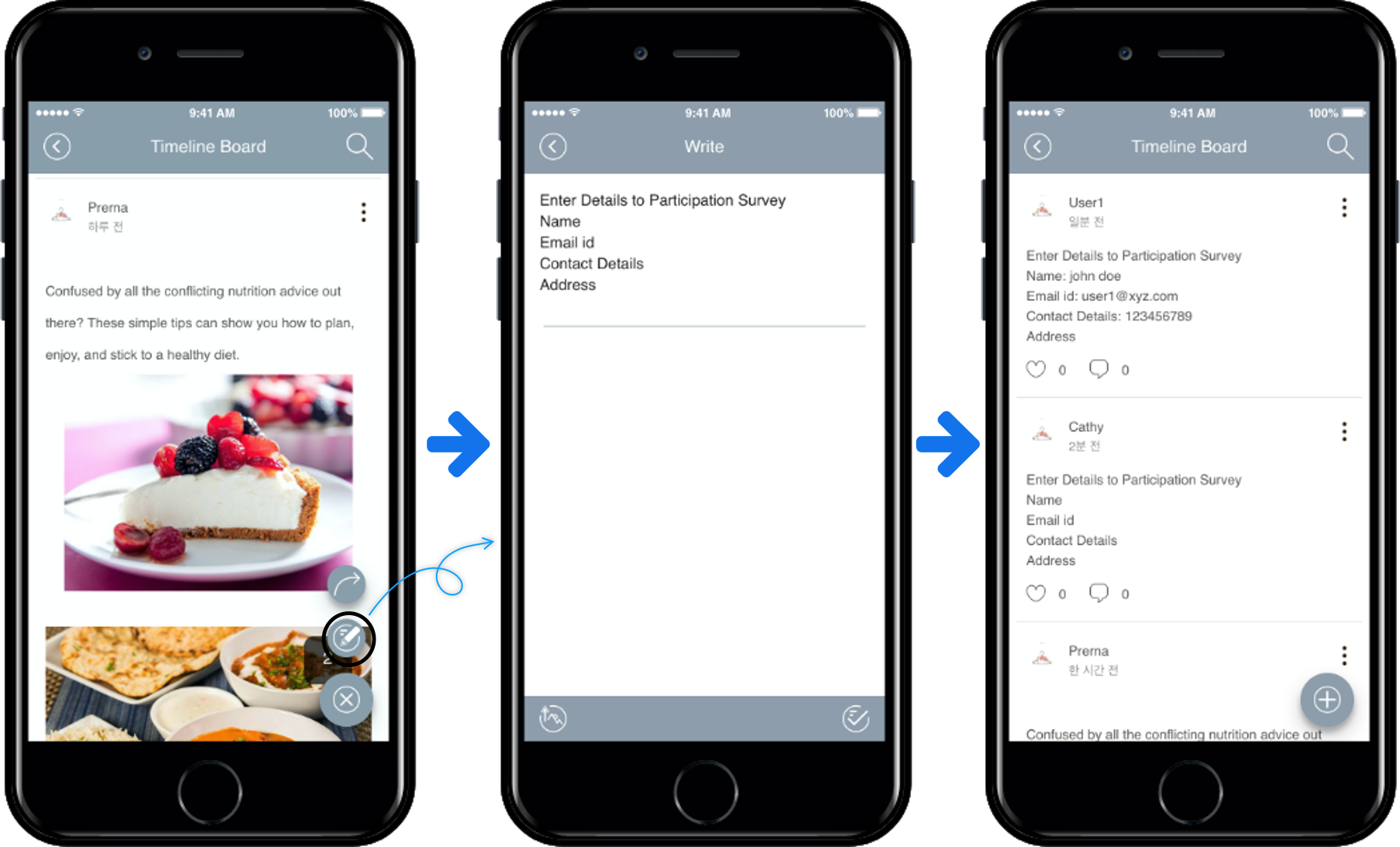 As you can see from the above app launch screen, when you write a post, the question items are pre-filled like a questionnaire. Depending on the question, the user can enter and save the answer.