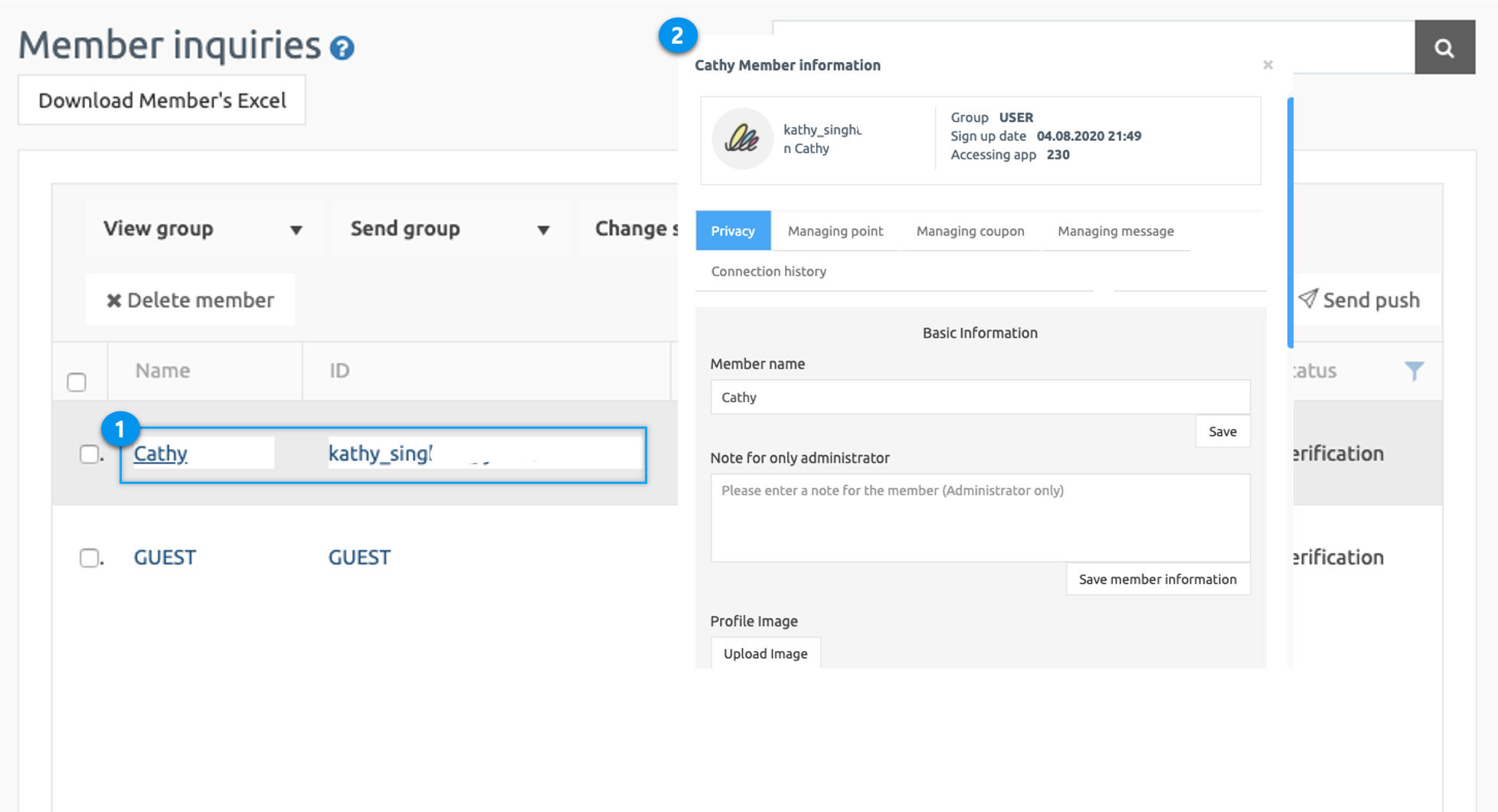 Go to the app operation page → Push&Member → Member Inquiry menu.