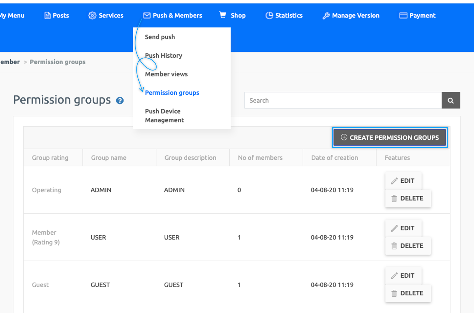 Go to the app operation page → Push&Member → Permission Group Settings menu.