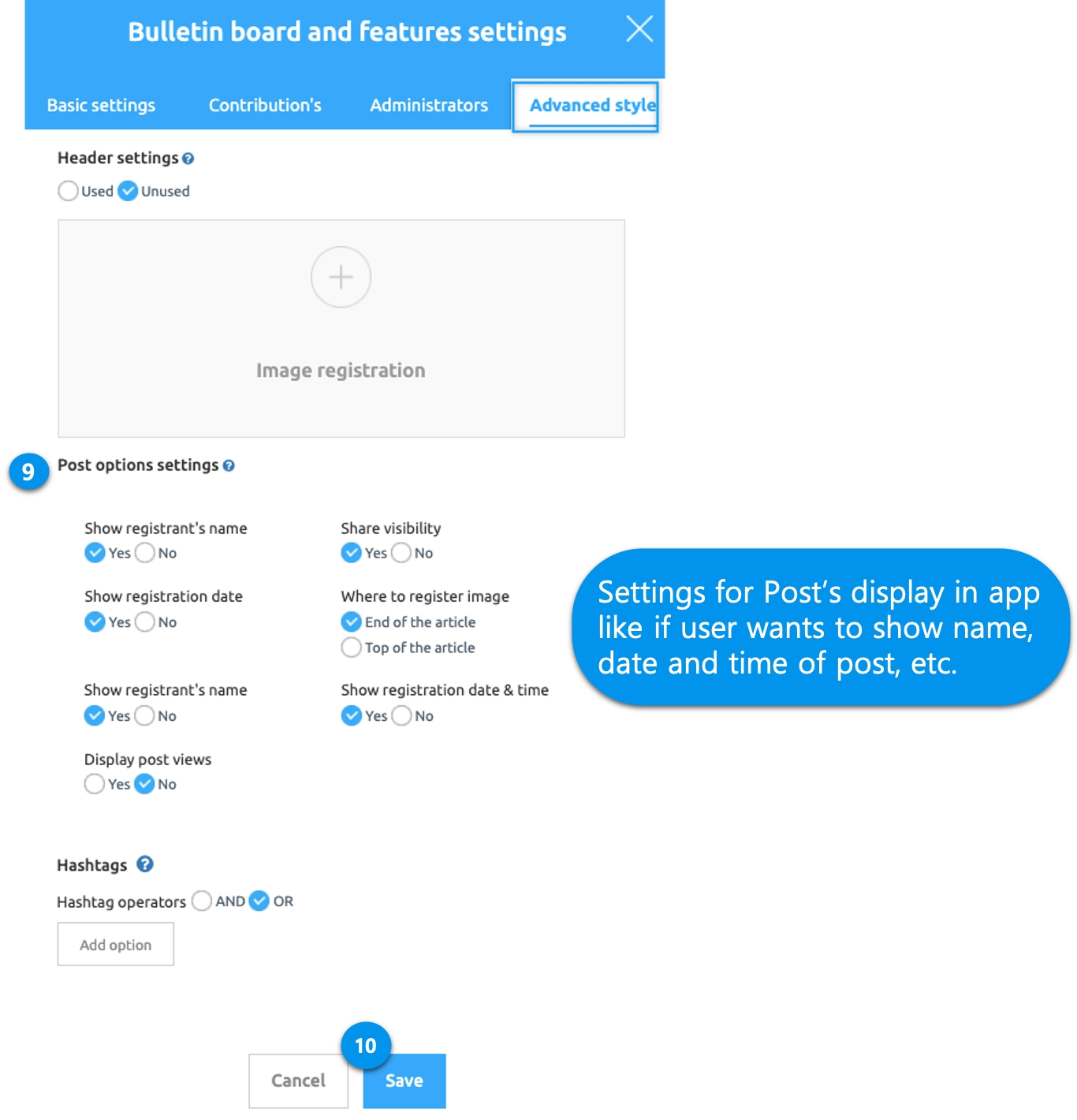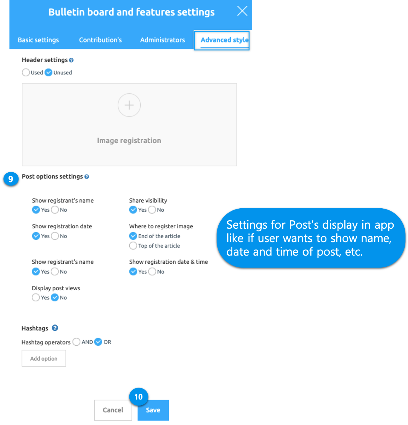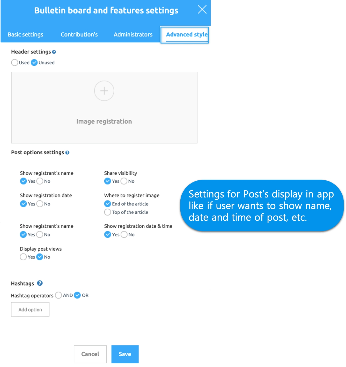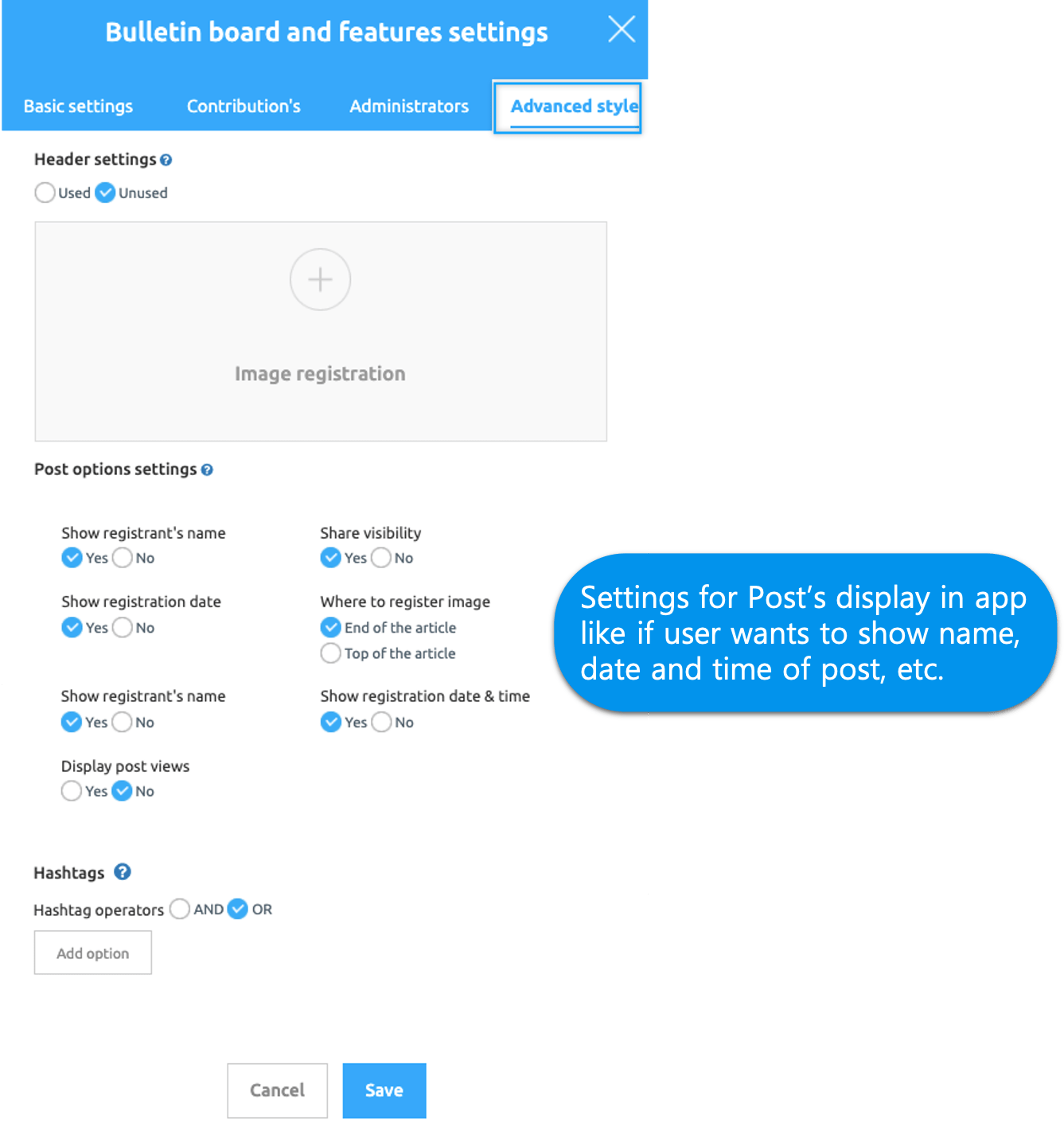 Advanced style post option setting is a menu for setting post options such as displaying the name of the registrant who created the post, the date and time of registration, and the number of views.