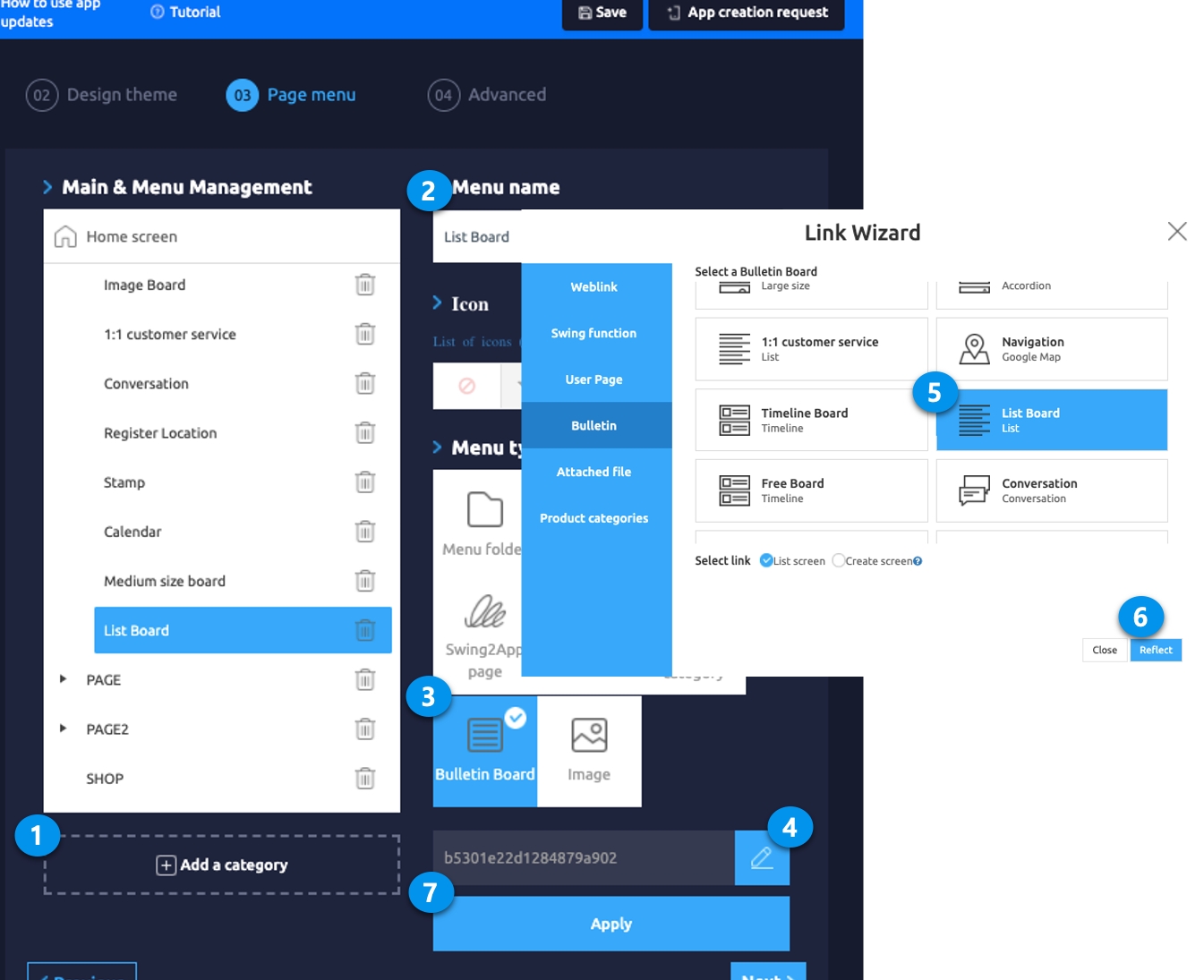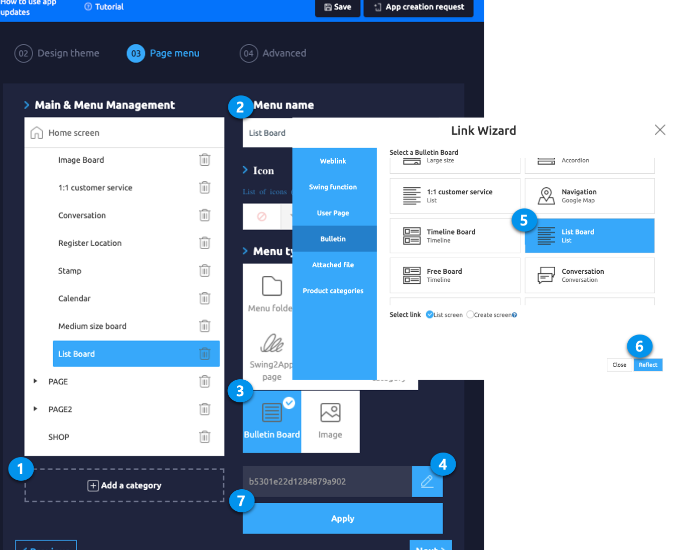 The bulletin board you have created must be applied to the app menus on the app production page so that it is reflected in the app.