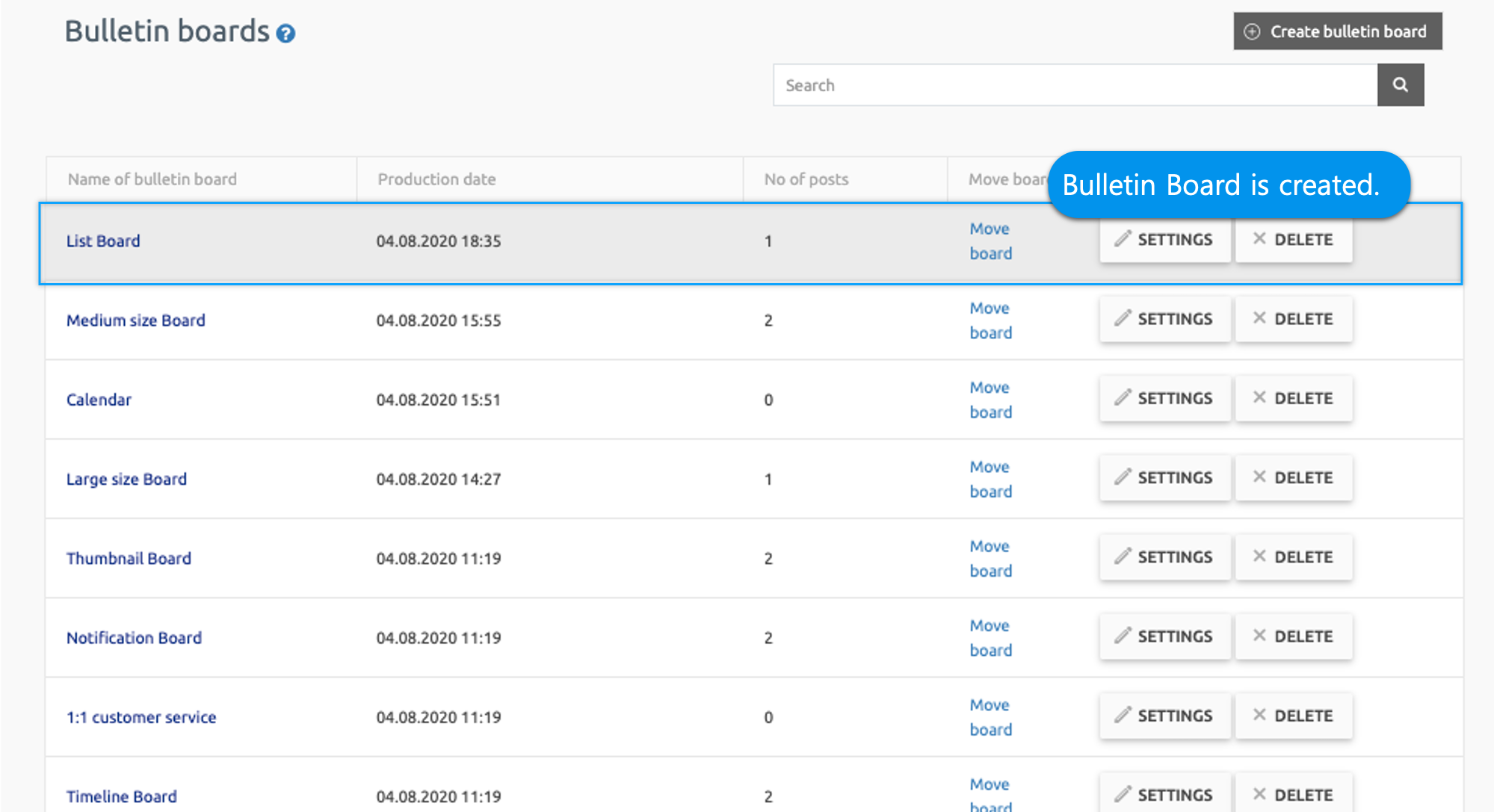 *User can create bulletin board by either creating a new board from Create Bulletin Board or by clicking on Settings of default bulletin board.