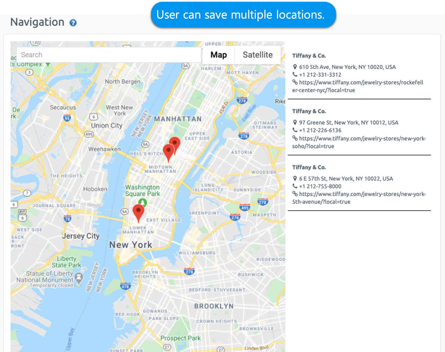 *Search for Tiffany & Co. and add them to my location so you can show them in Google Maps.