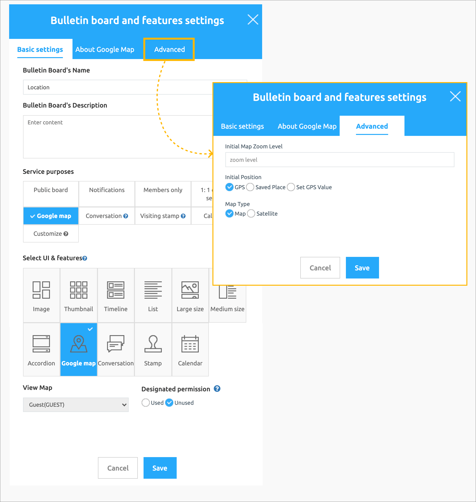 1) Manager → Services → Bulletin Board → Select [Create bulletin board] button → Basic setting of function setting window → Select UI and function: Google Map → Apply [Advanced setting] and save
