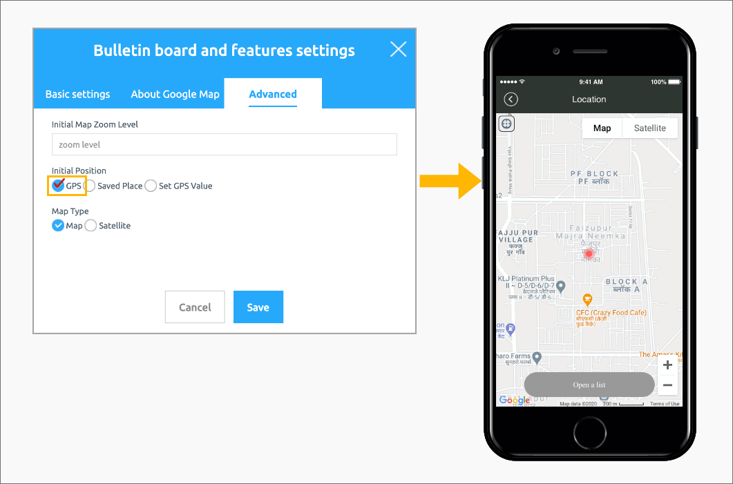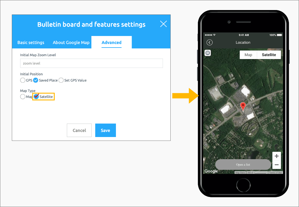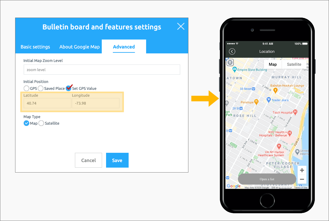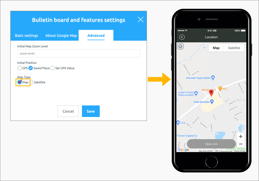 The advanced settings of the location registration (map) bulletin board provided by Swing2App are not required.
