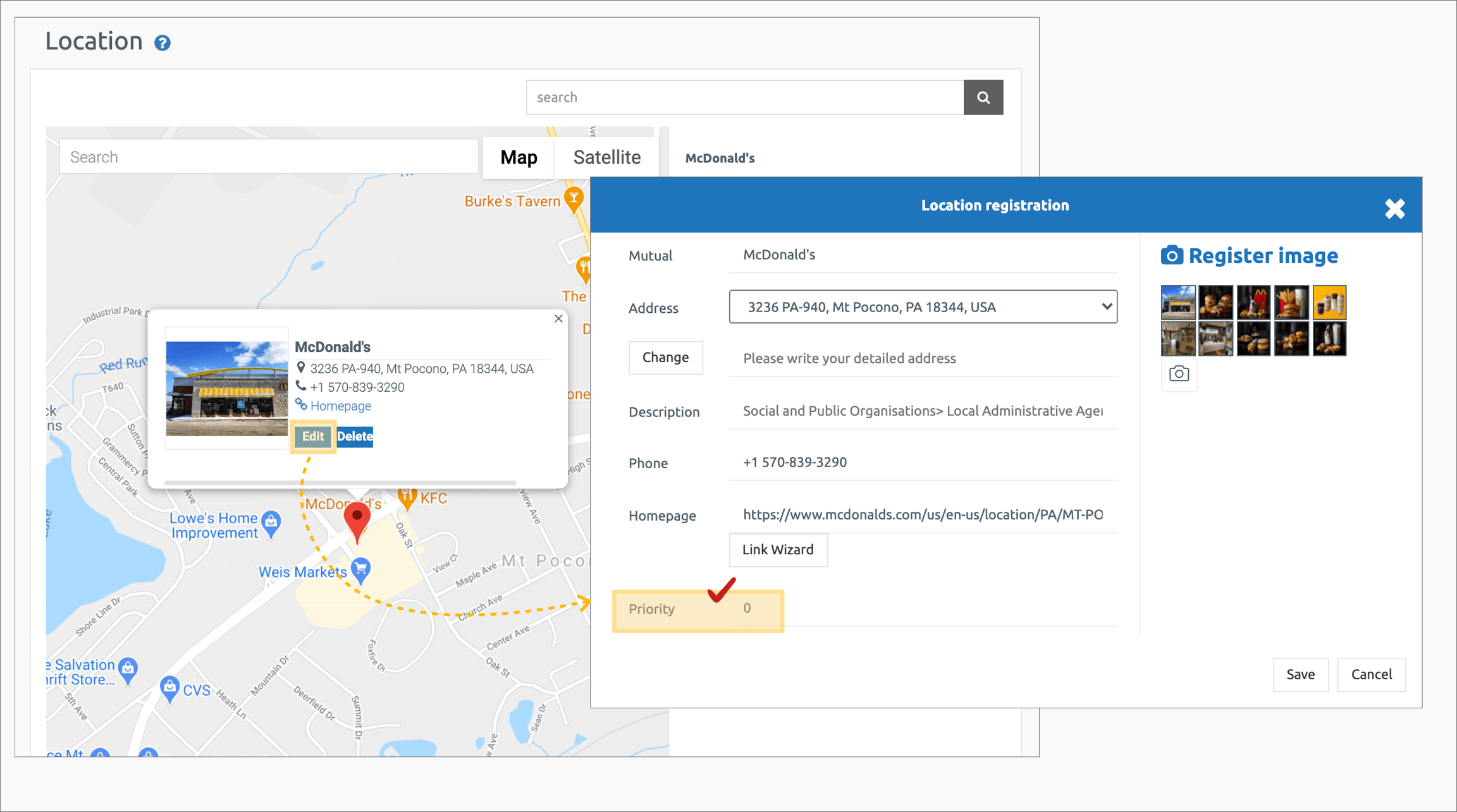 (2) Priority: The map screen of the location is displayed according to the registered priority.