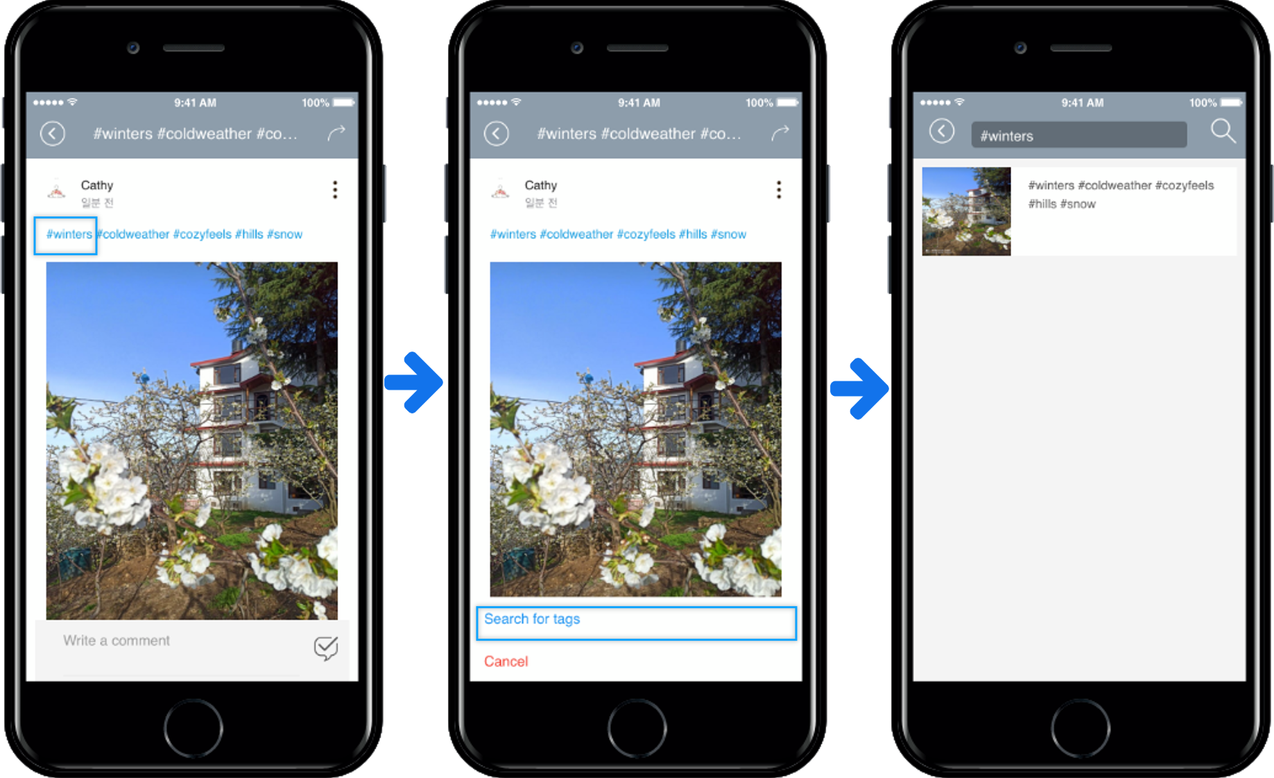 You can use the same tag search ability like on Instagram. If you enter a hash-tag and select a specific hash-tag, you can search for posts with the same hashtag. For example, if you select ‘#swing2app’ among the hash-tags entered, all posts containing the swing2app tag words will be found and displayed.