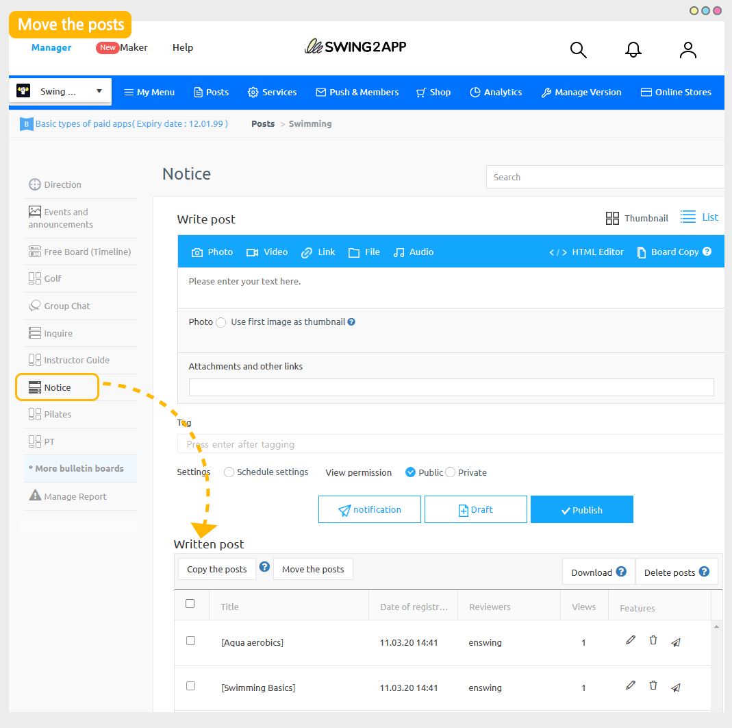 1\) App Manager screen – Select the board created in Manage posts (The board where you want to move the post)