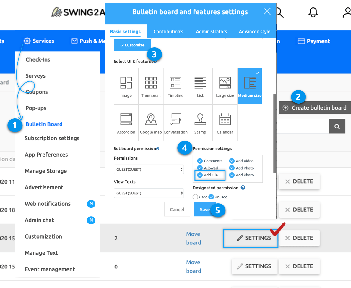 If you need to create a new bulletin board click Create bulletin board or you want to edit the existing bulletin board by clicking on the Settings button.