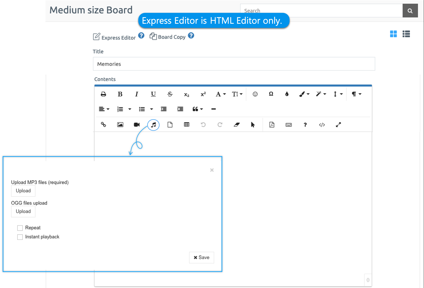 Upload music files (audio MP3 files) to the bulletin board.