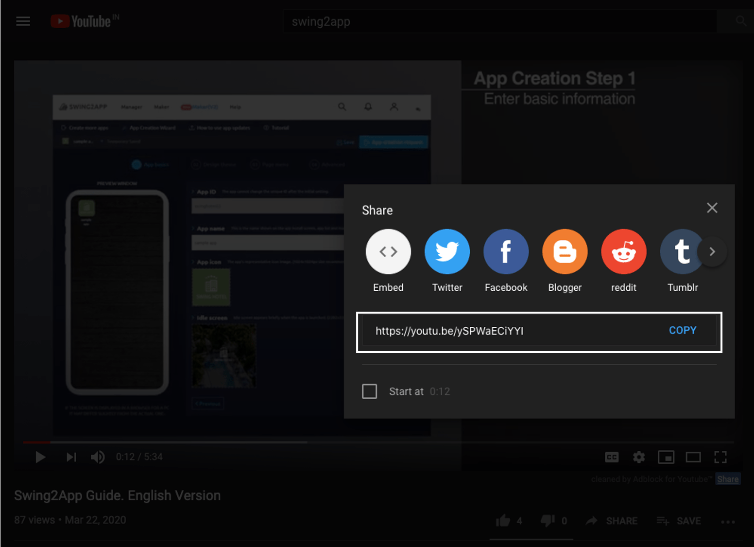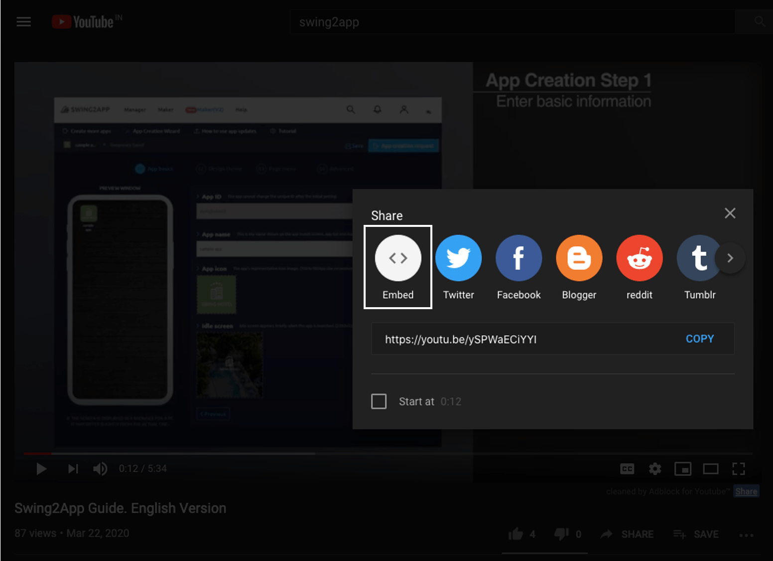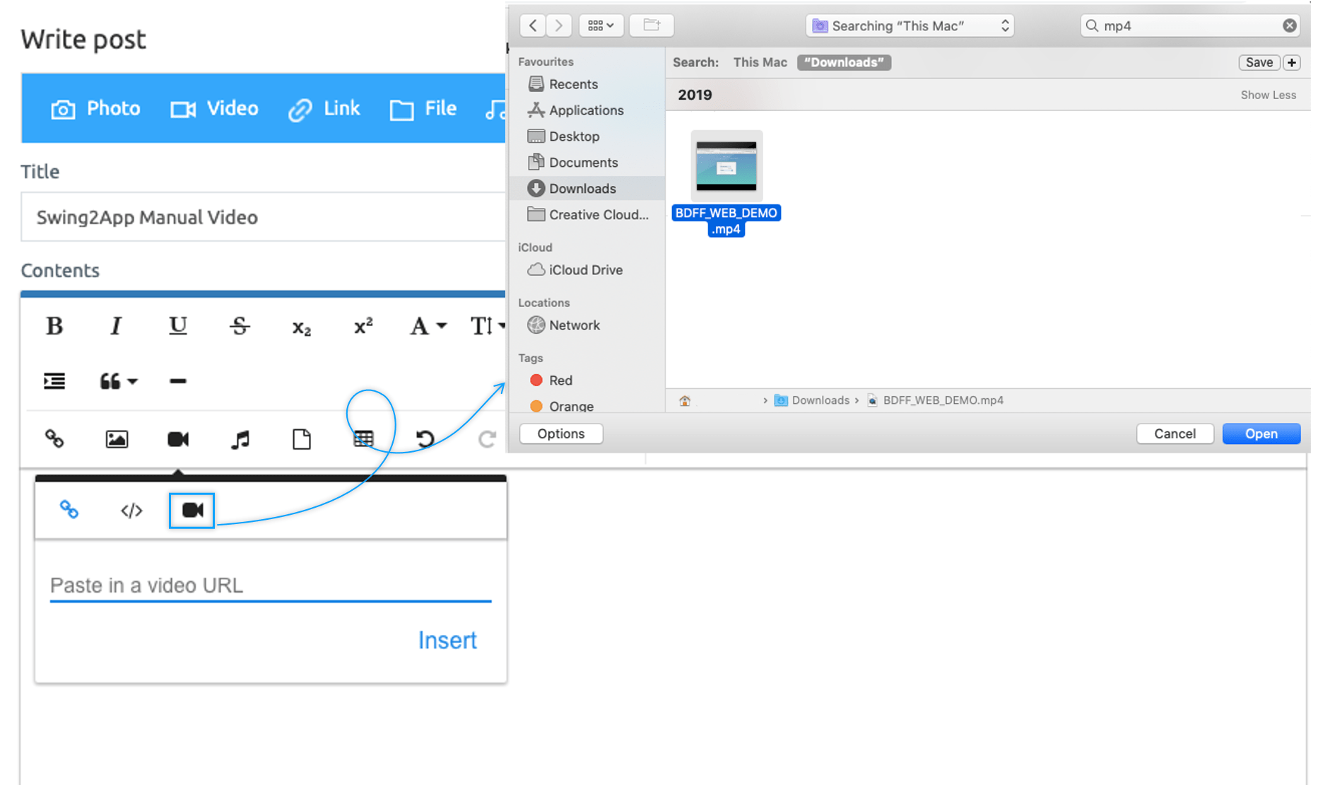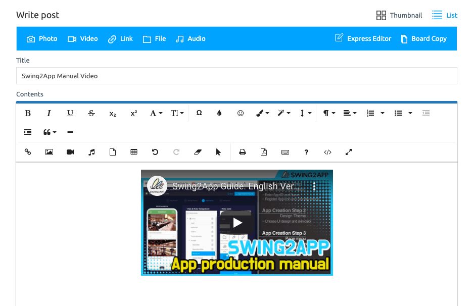 Registering a video in a post is not available in the app, but can only be registered on the Swing2App web dashboard(app manager only).