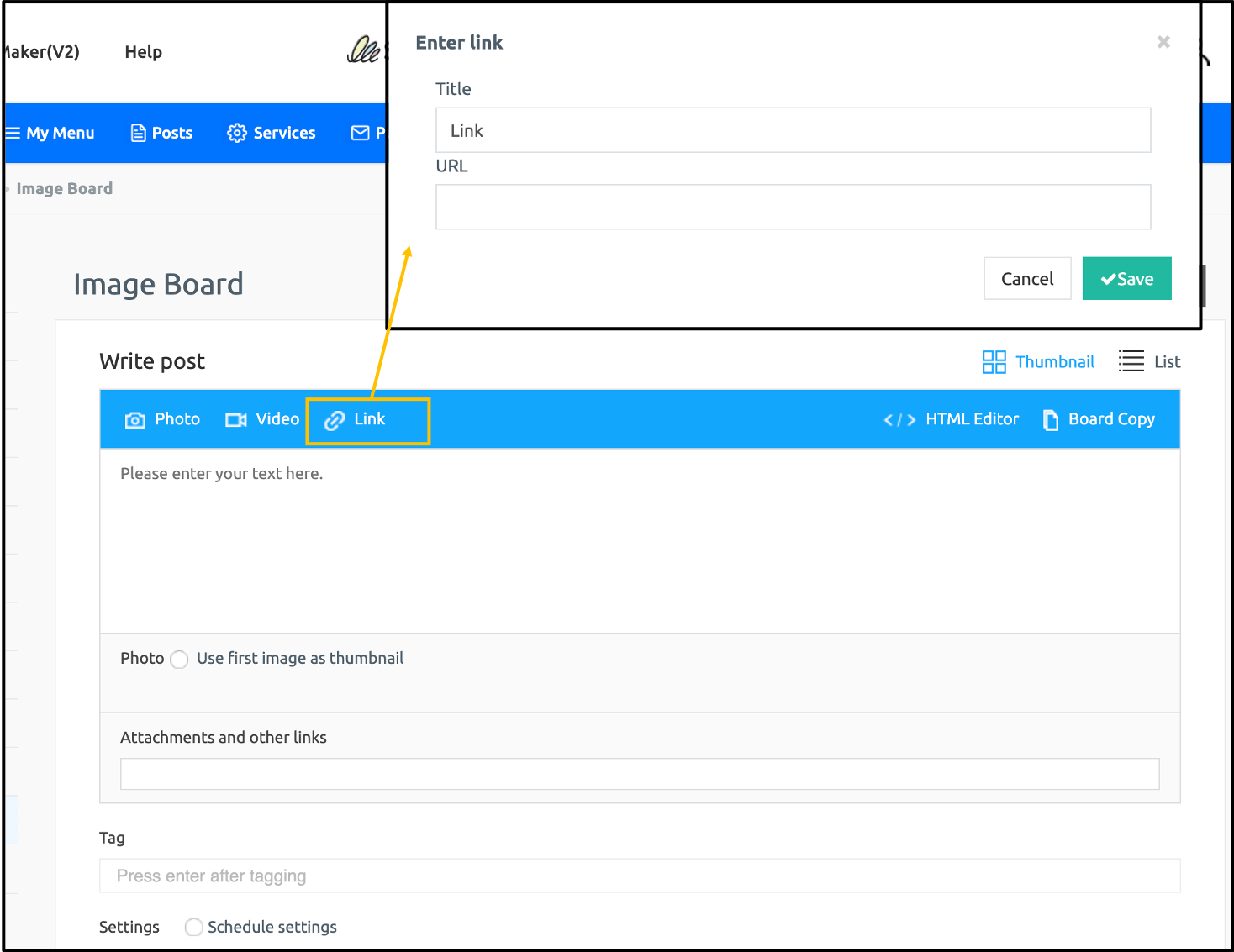 *The bulletin board can be written in the post-management after creating the necessary bulletin boards first in the service management – bulletin board management.