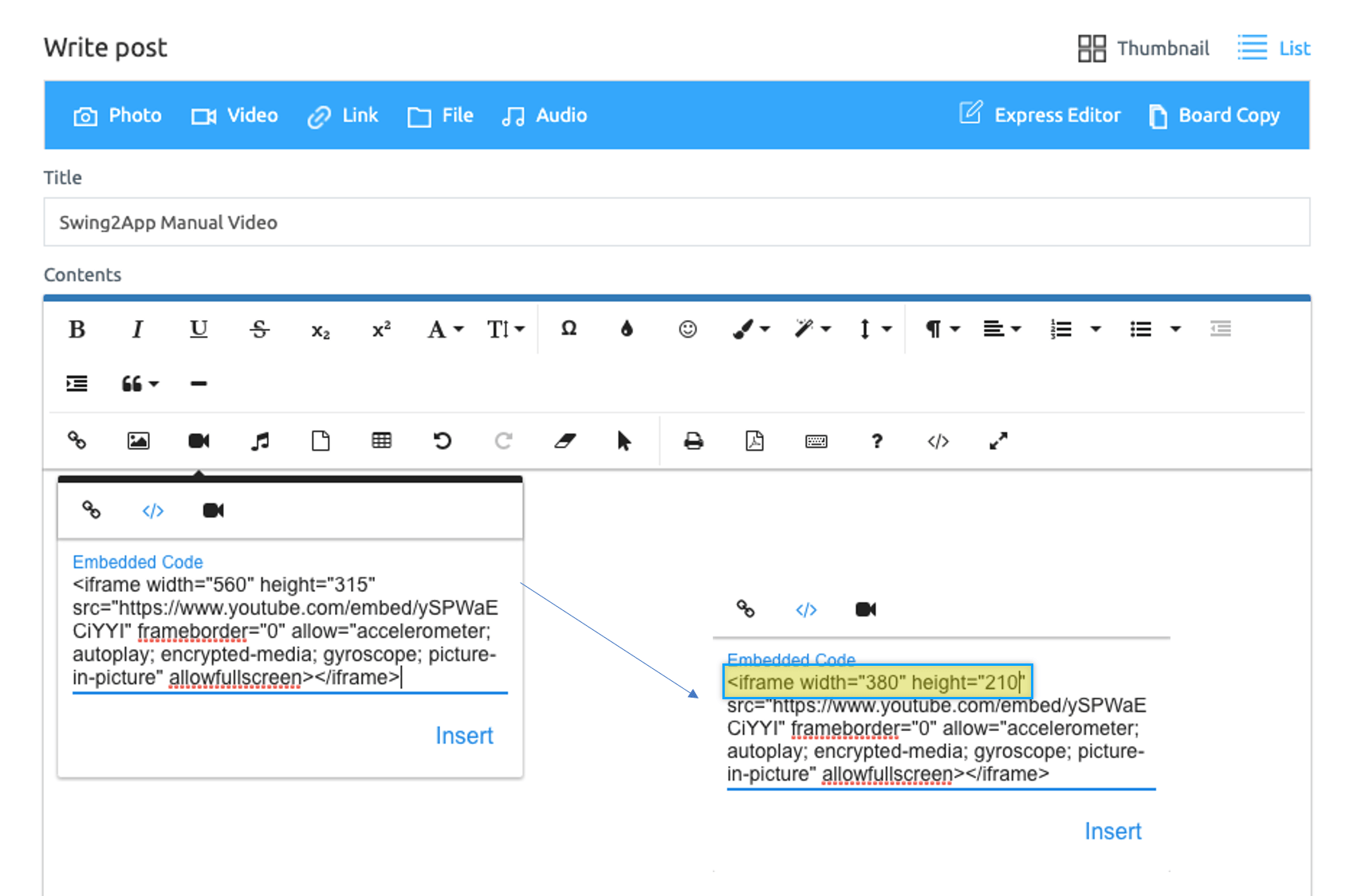 After pressing the Insert Video button, select the second ‘Embedded Code’. Paste the embedded code.