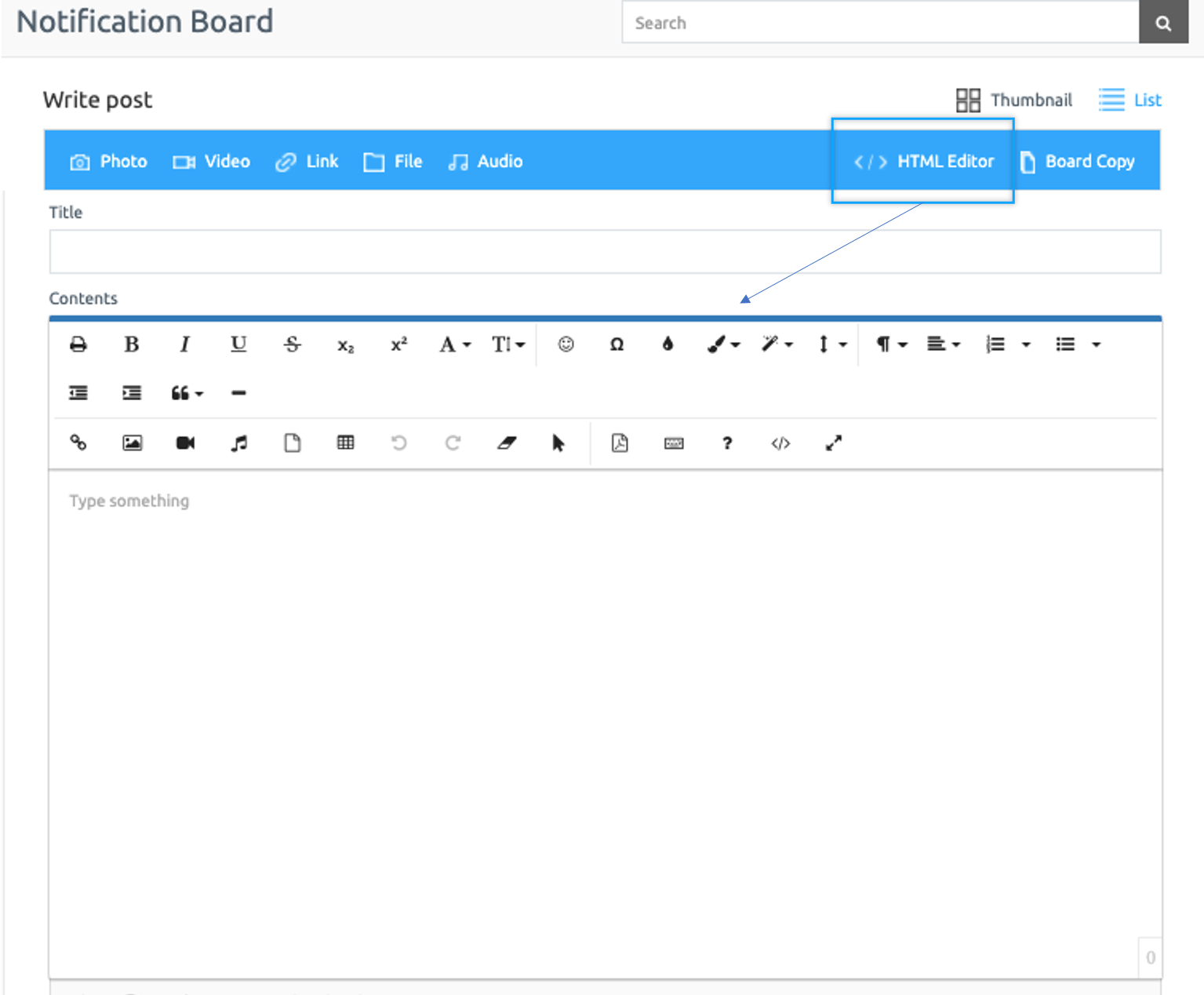 You can choose a simple editor or an HTML editor. You’ll need to choose the HTML editor here to write so you can freely use other writing options, such as registering videos. (HTML editor writing: font size, font, font color, table, web link, photos, videos, music files, formatting, etc.)