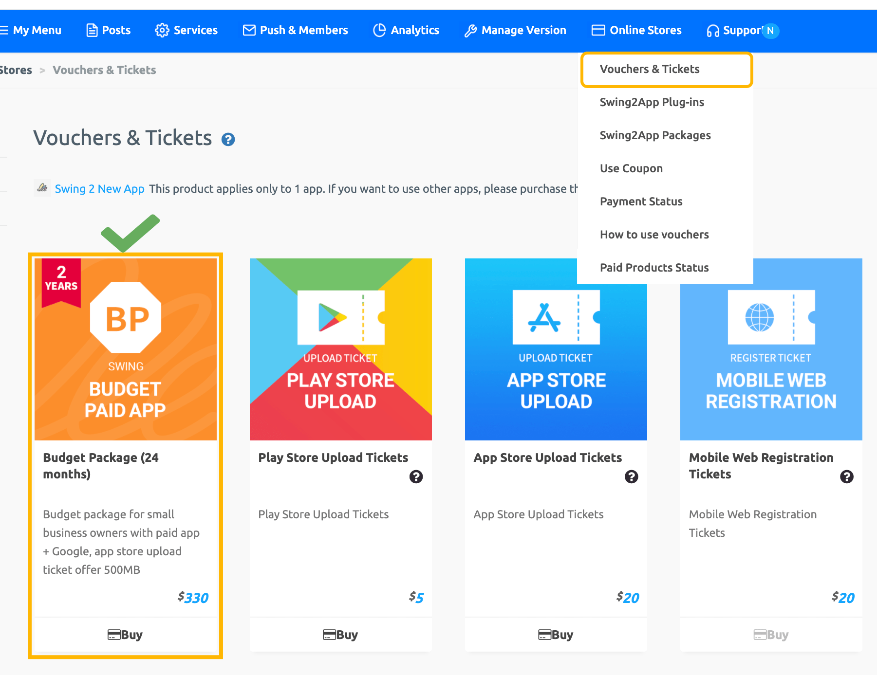 2) Manager → Online Stores → Vouchers & Tickets, select to purchase ‘Swing2App Budget Package (24 months) $330.