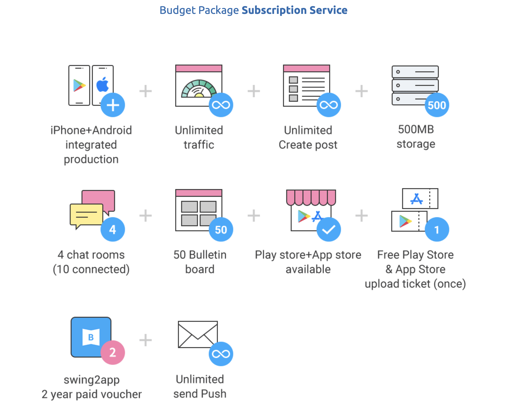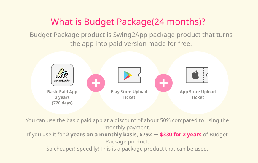 2) The Budget Package is a package product that includes [Swing 2 years (720 days) paid pass + App Store upload ticket + Play Store upload ticket].