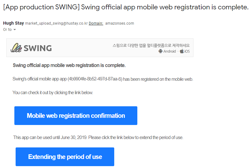 Completion of the app: Manager → Online Stores of Swing2app Vouchers & Tickets (select as you want) → purchase domain to register site (purchase separately) → mobile web registration ticket payment → mobile web upload application from version control-app production history page → after application Mobile website launch in 2 days. ★Mobile web registration is not available in the free version.