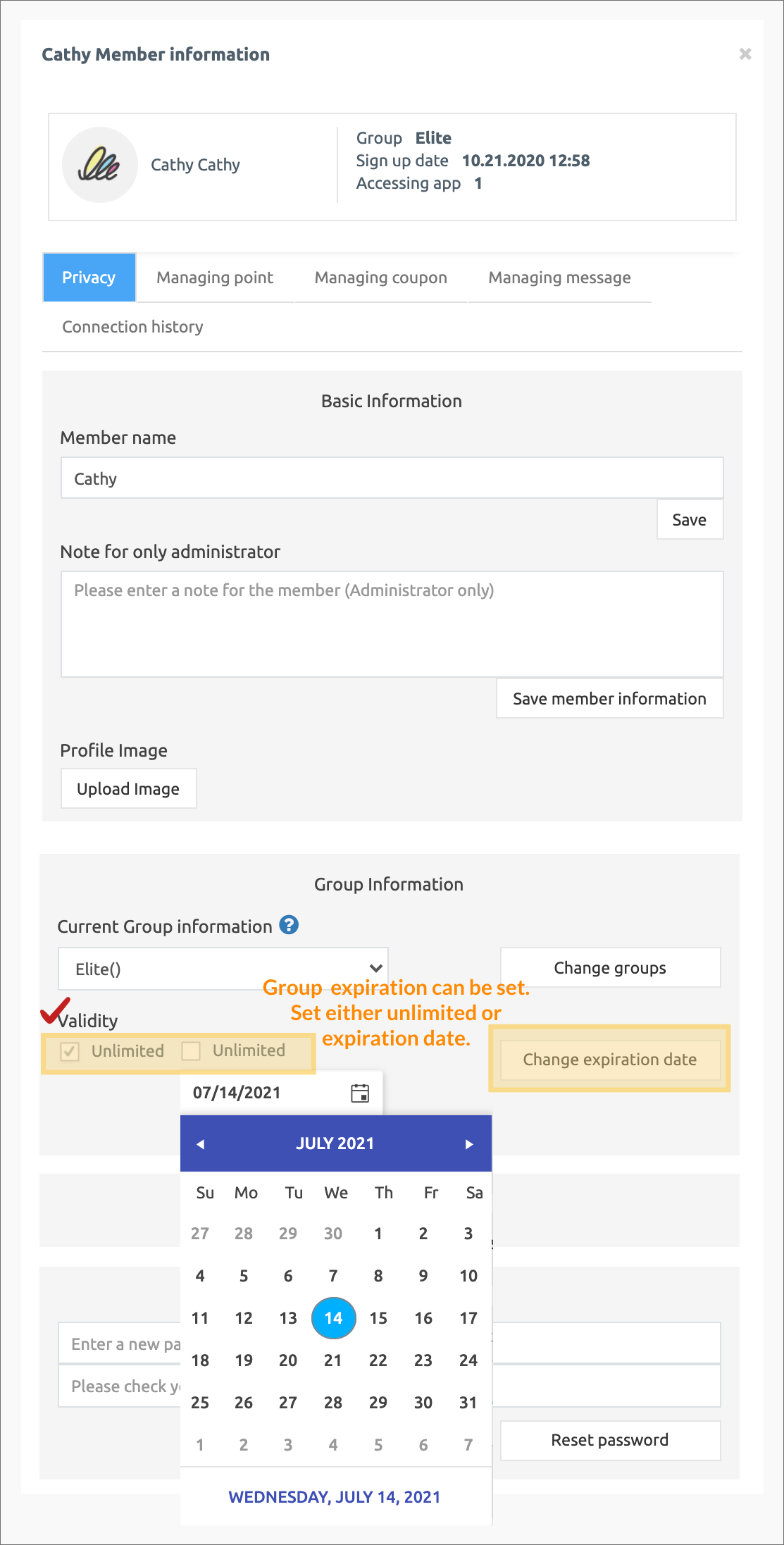 *Expiration Date: You can decide whether to use the group granted to the member for an unlimited period without a time limit or to set an expiration date by setting a period