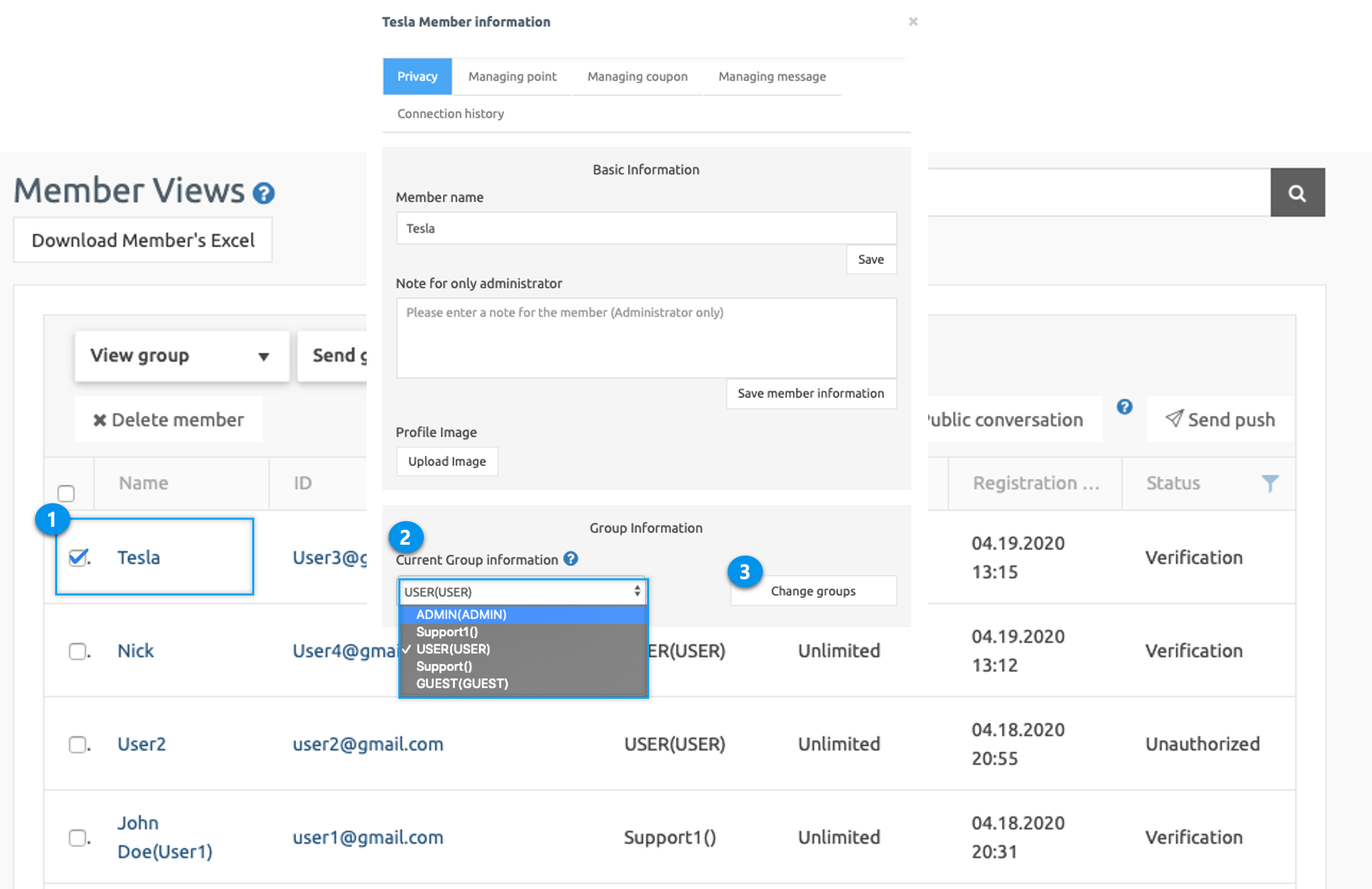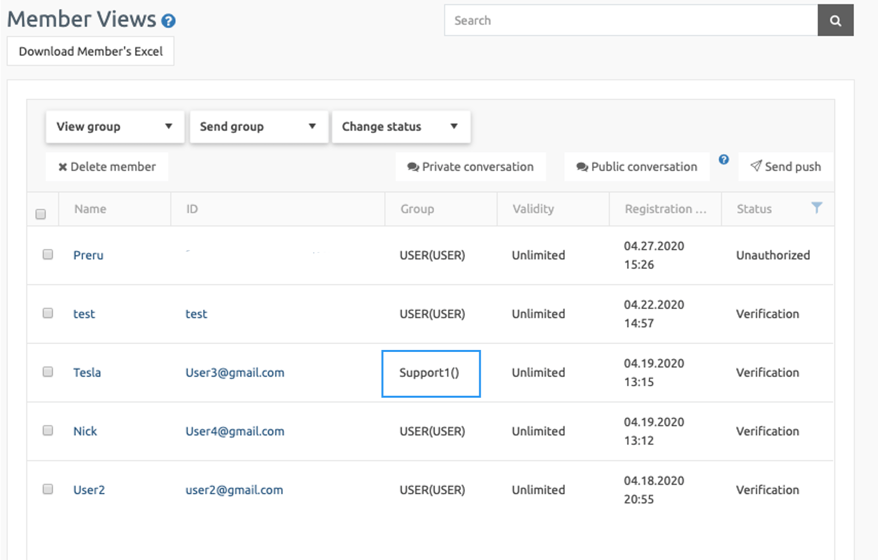From here, you can change the group by selecting the members whose group you want to change.