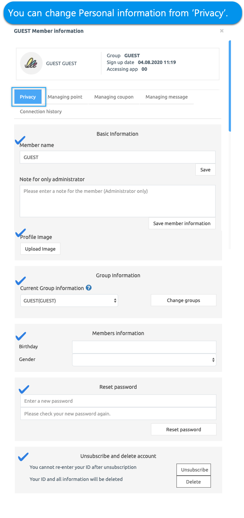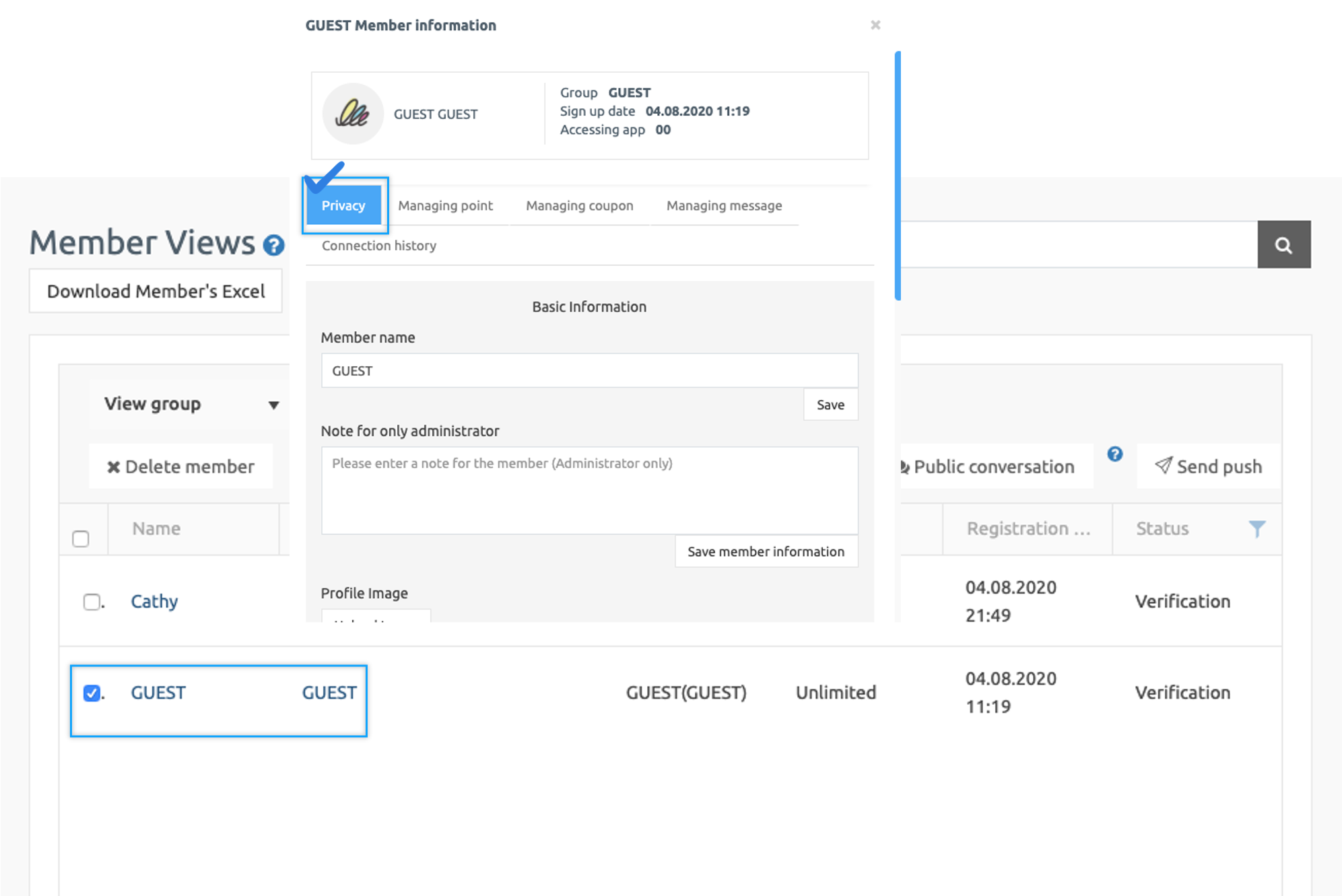 You can check the member name, administrator notes, and profile image items.