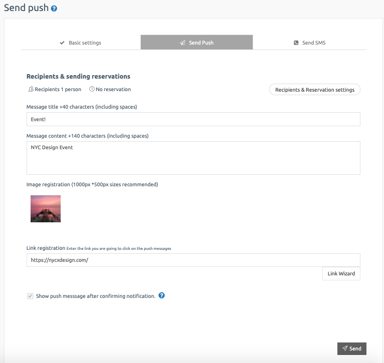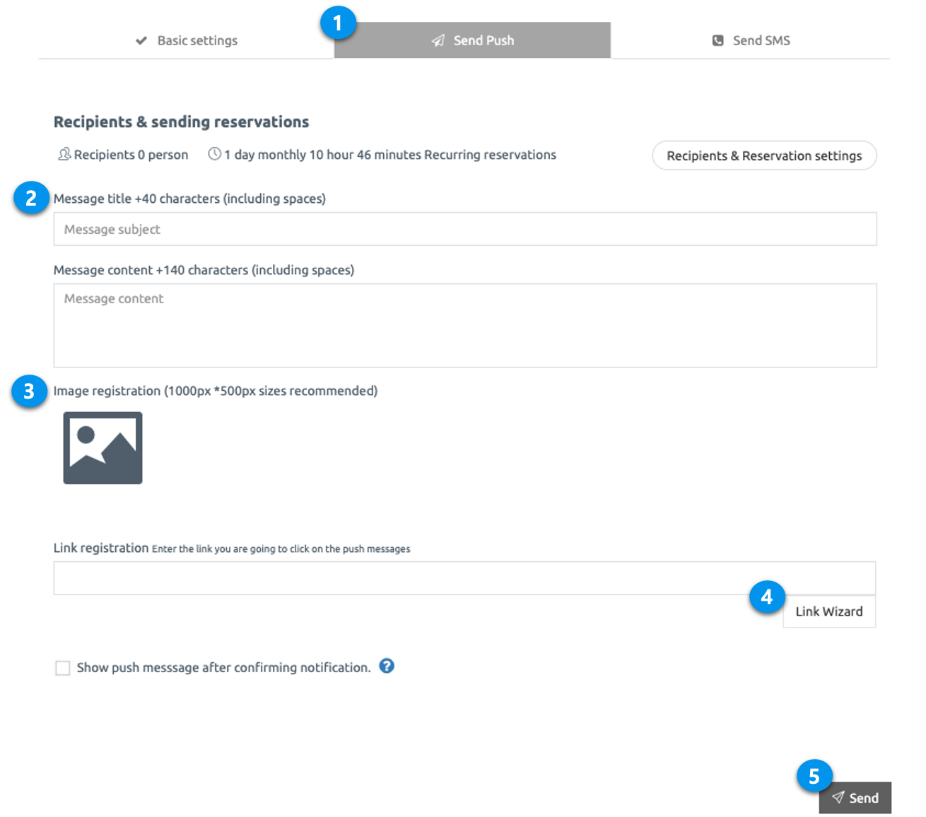 The first step in sending a push is the default setting. You can set the recipient selection, schedule setting, and repeat in the basic settings.