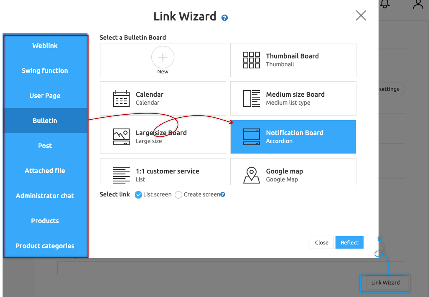 Link Wizard: Link Wizard is a feature that allows you to apply a link to where to go in the app when you touch the sent push. Select the [Link Wizard] button and select which page to link to when sending push. *Please check the details below.