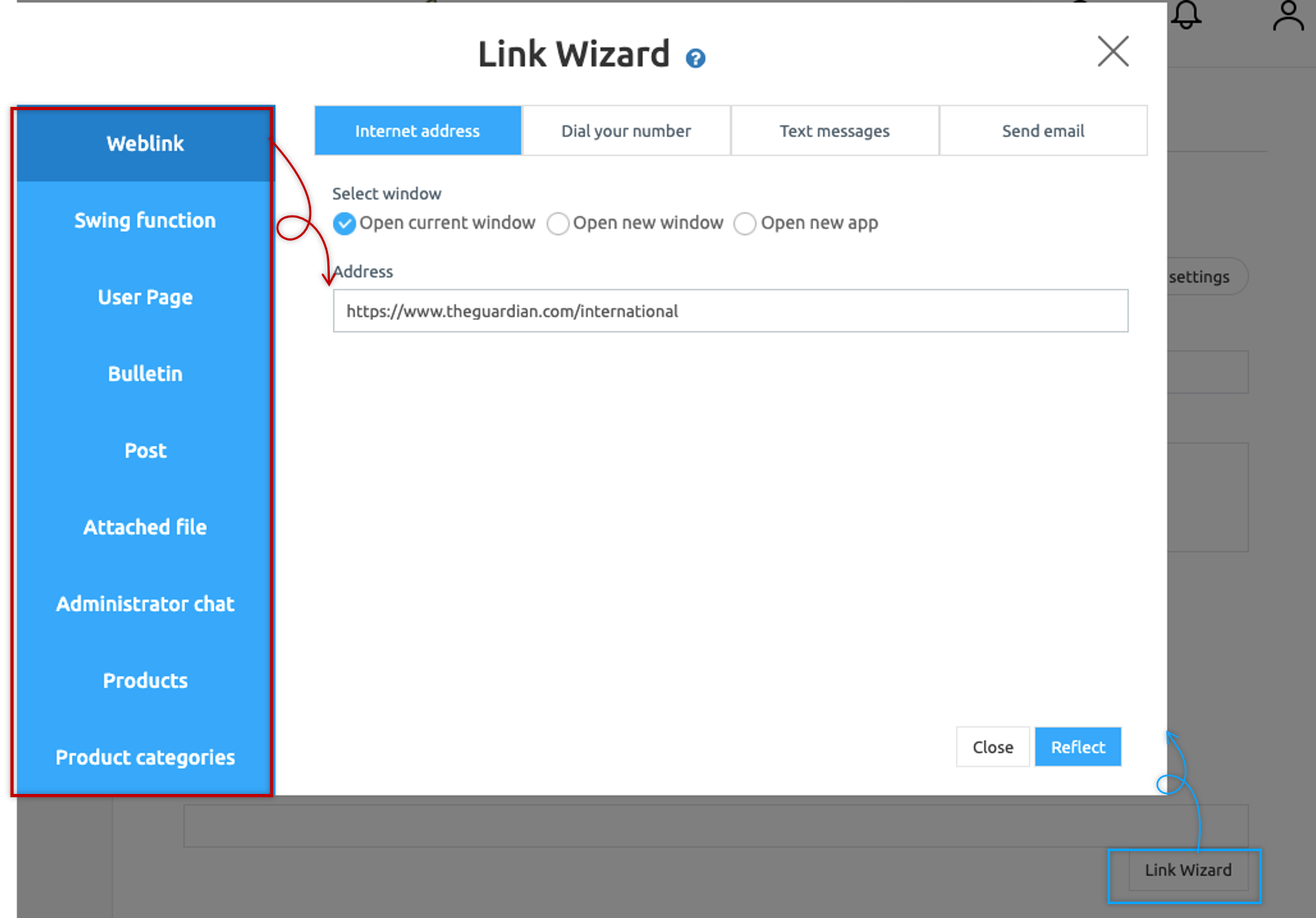 In addition to web links, you can link with functions, pages, bulletin boards, and posts provided by Swing2App.