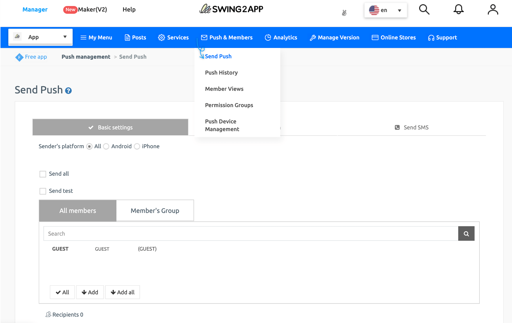 Send all: You can send a push to all users using the app.