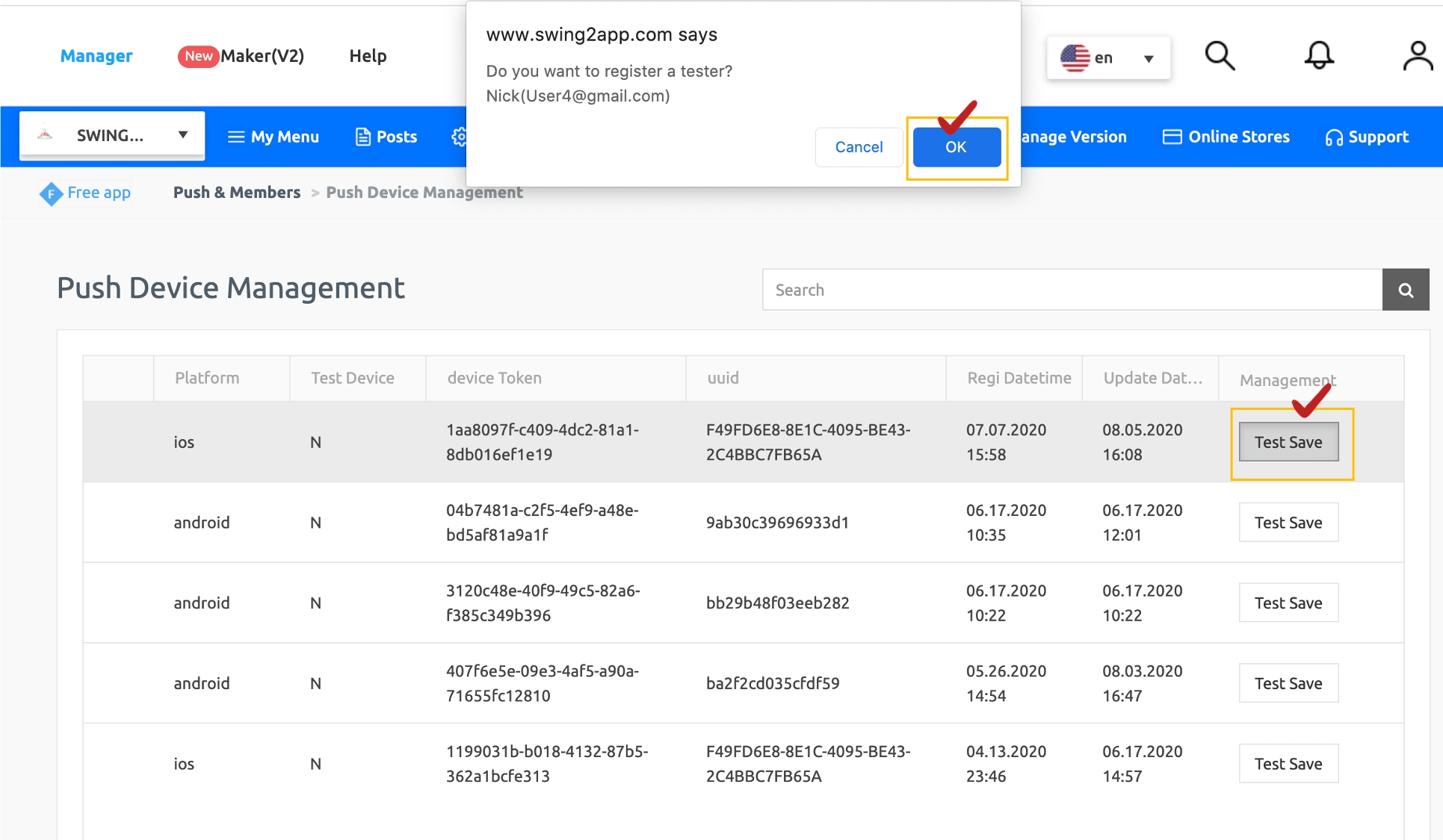 Check the ‘device_token’ on my mobile phone and press the [Test Save] button of the corresponding device to register the device as a test.