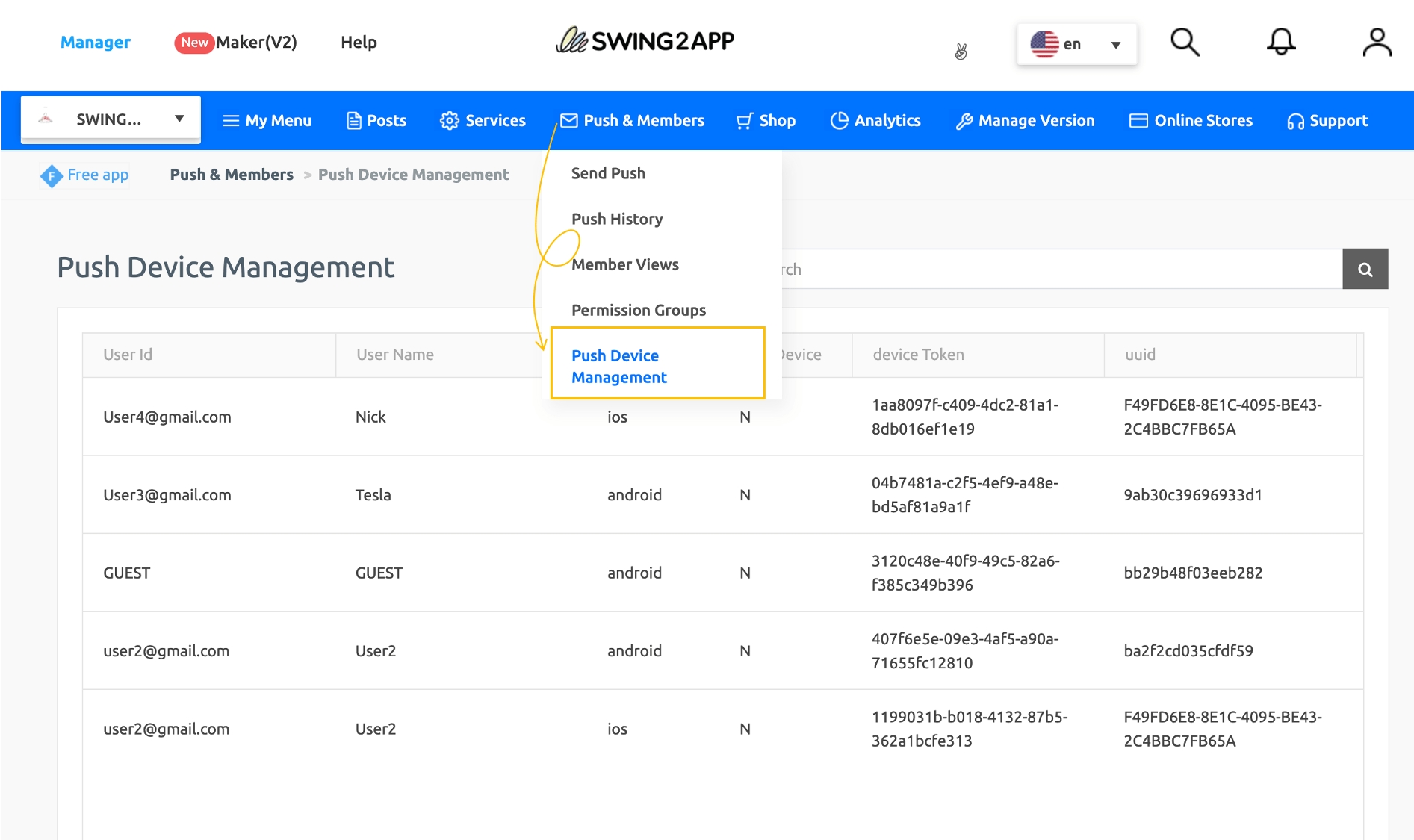 On the push device management page, you can check the list of mobile devices that have installed the app.