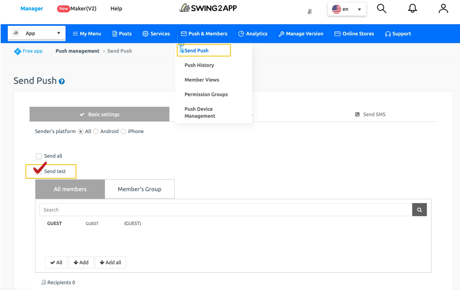Therefore, if you register the operator’s cell phone as a test device using the push device management function, and then send a test from the push sending menu, the push will be sent only to the cell phone registered as a test.