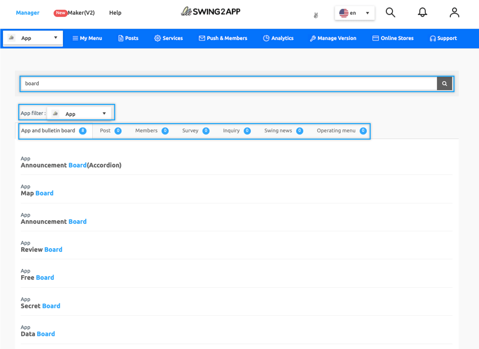 You can find what you are looking for by entering a search term such as bulletin board, post search, member search, or operating menu search provided by Swing2App.