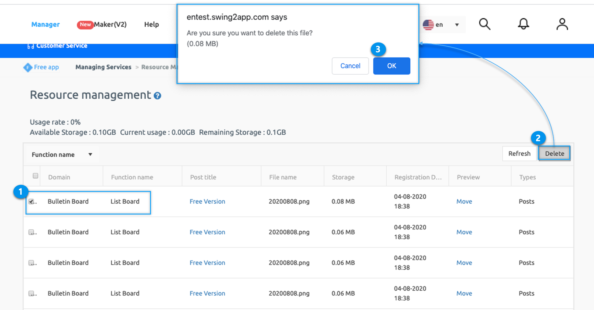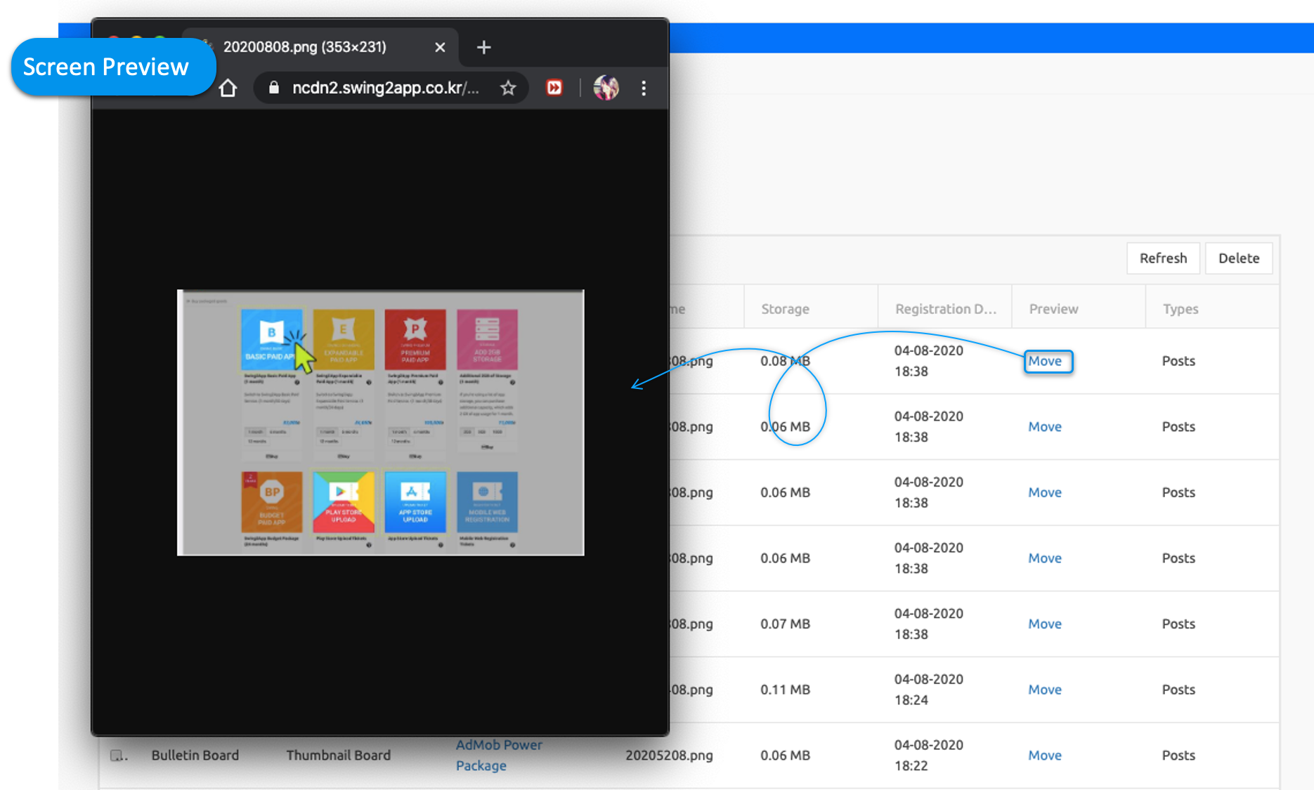▶ Can I reduce my app’s capacity by deleting posts, images, etc. that I don’t need? If you go to the resource management page, you can see the list of each post. You can check the contents of the post by clicking on Move under selecting Preview now and can delete the post if not required. The more post you delete, the more capacity you have.